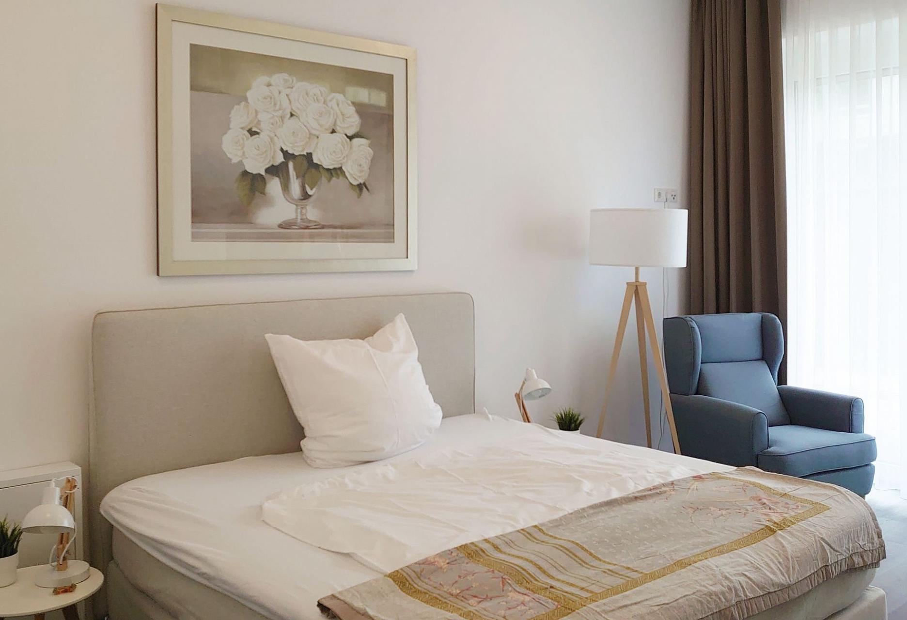 The guest room is on the ground floor of the house, close to the nursing service's offices and can be easily reached from the parking lot via a separate entrance door. The room is furnished with a comfortable double bed, a seat, a television and has storage space for clothes and items you bring with you. You will also find a barrier-free bathroom equipped with a shower, toilet and towels.