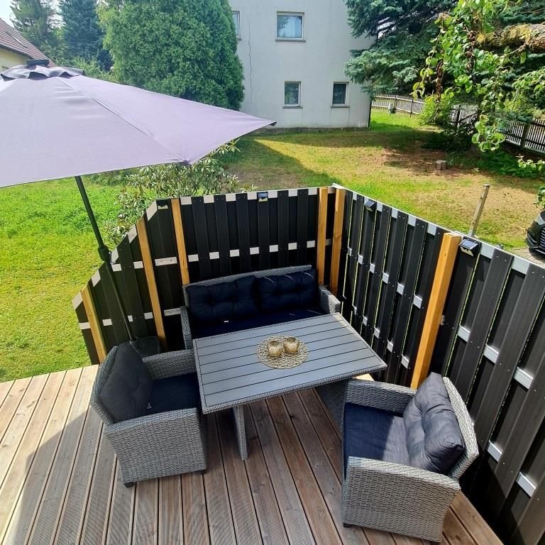 Die große Terrasse aus Holz befindet sich im Gartenbereich (im Grünen) und ist mit bequemen, modernen Gartenmöbeln ausgestattet. Für die Sitzpolster gibt es eine Aufbewahrungsbox. Auf der Terrasse befindet sich eine geflieste Grillecke mit Grill.