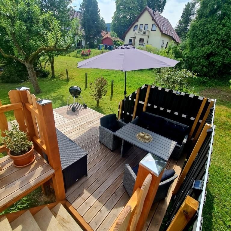Vom Wohn-/Essbereich gelangt man zu einem kleinen Balkon. Über wenige Stufen ist die große Terrasse (ca. 15 m²) mit Grillecke, vom Balkon aus erreichbar. Der Berg Töpfer ist vom Balkon und Terrasse aus tlw. zu sehen 😉