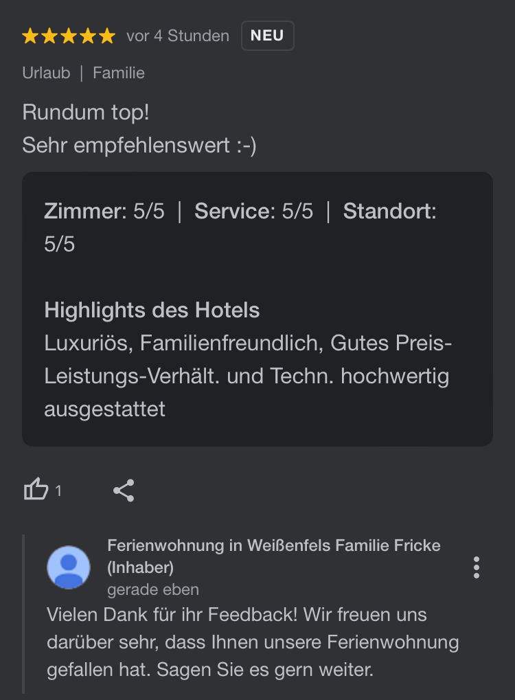 Trau dich und hilf anderen Gästen einen Eindruck zu verschaffen wie der Aufenthalt in unserer Ferienwohnung war. Vielen Dank dafür!