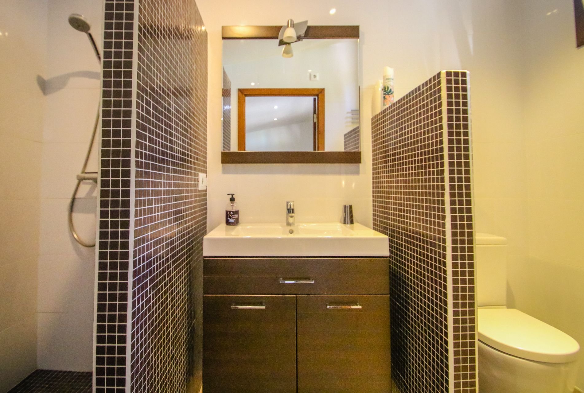 There are two bedrooms, a master bedroom with en-suite bathroom and a bedroom for 4 people (2 bunk beds), also with en-suite bathroom.