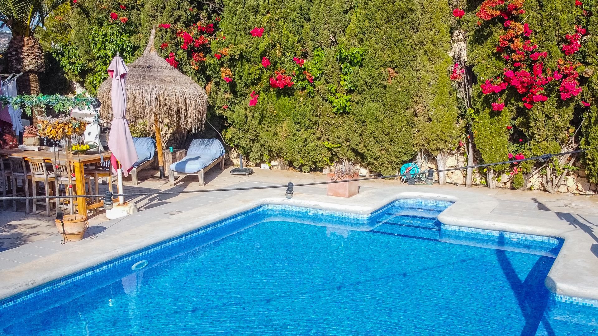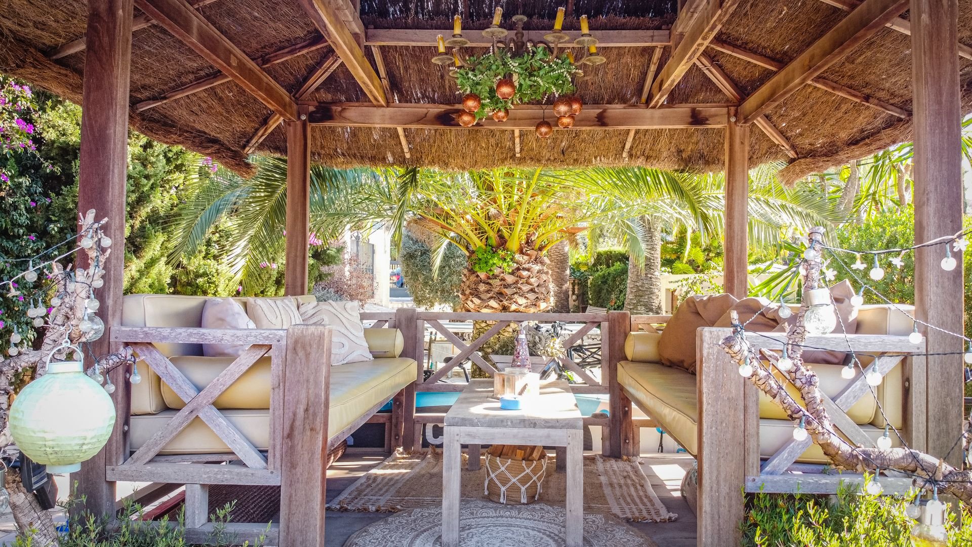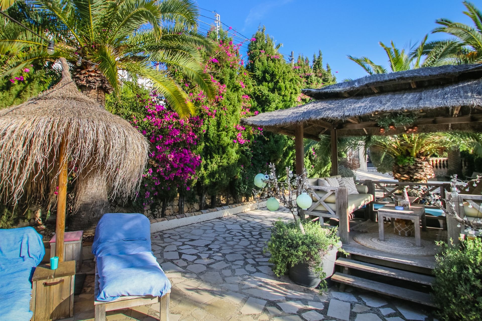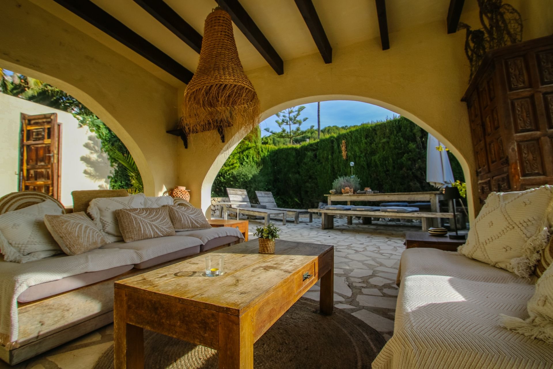 The terrace has a cozy sitting area under the veranda, including movable sun loungers and a large wooden dining table with benches.