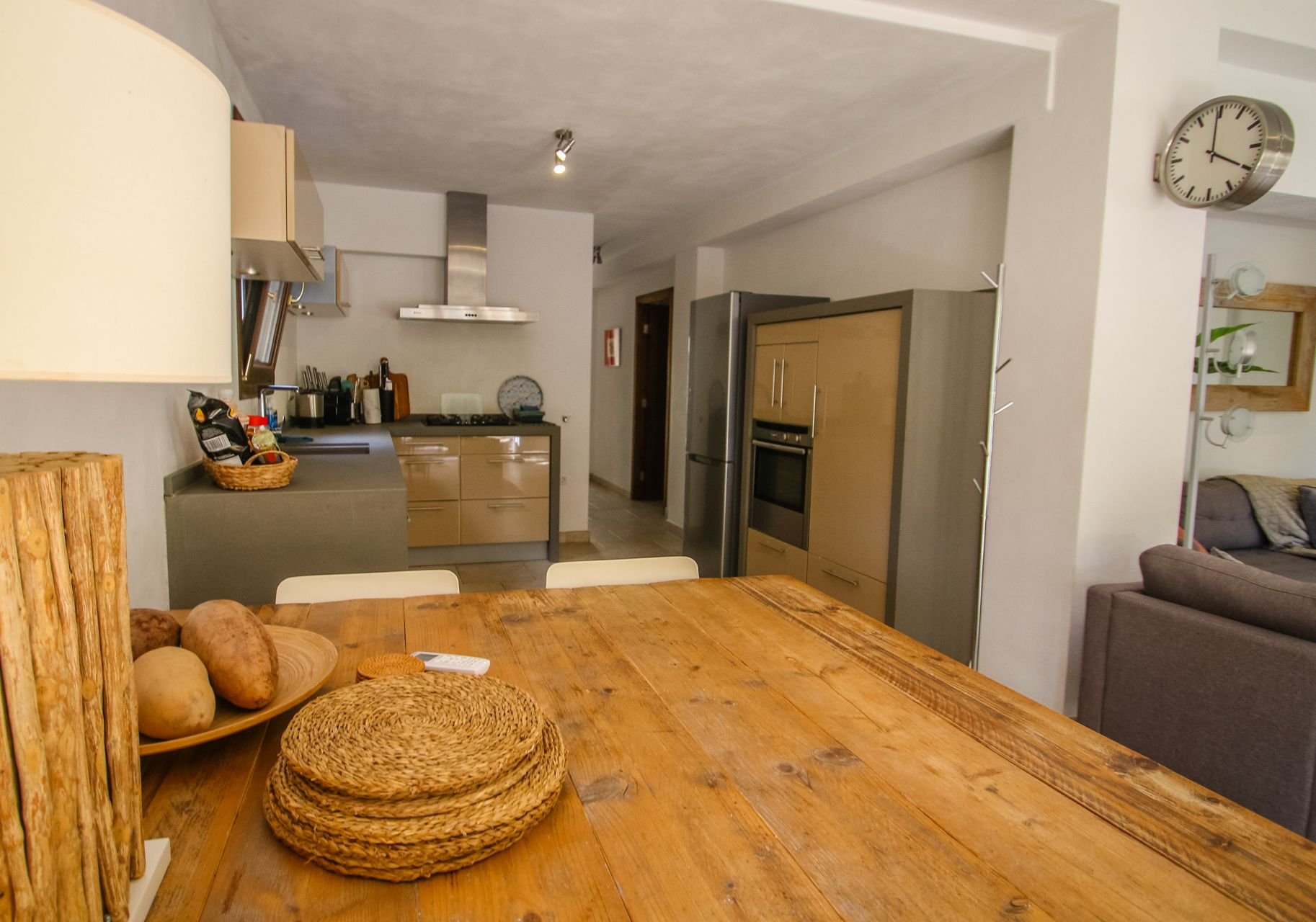 In the living room you will find a comfortable and well-kept interior with a large seating area, equipped with a large sofa and 2 armchairs, TV and French doors to the outside terrace. The dining table is located next to the kitchen, also with doors to the covered, shaded terrace.