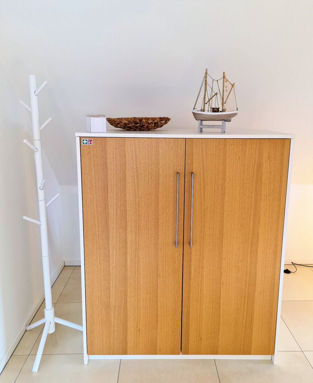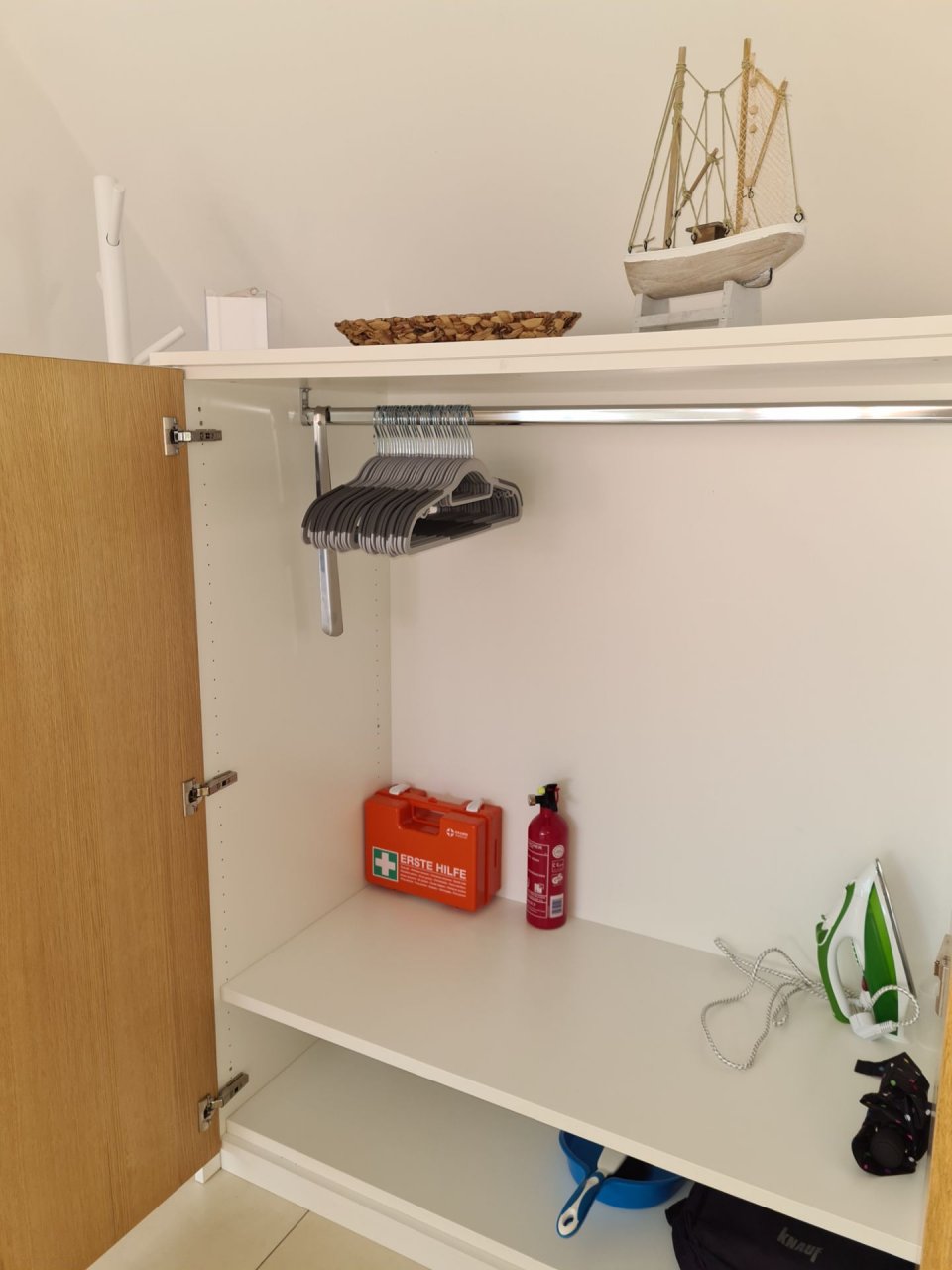 Im Wohnbereich steht ein Schrank mit Ganzkörperspiegel und Kleiderstange zum aufhängen von Kleidung zur Verfügung.