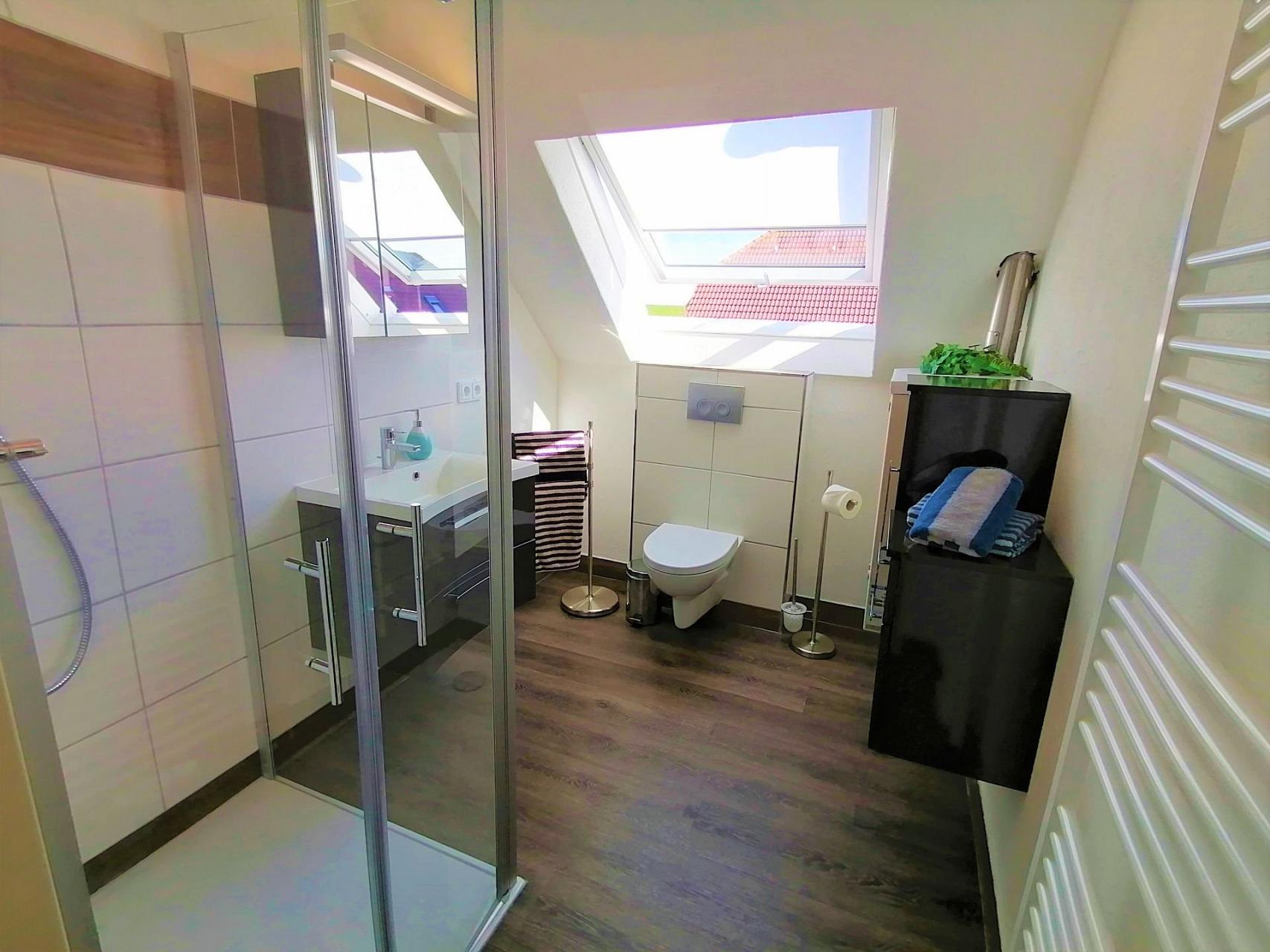 Im modernen Tageslichtduschbad befindet sich neben dem WC eine fast ebenerdige Dusche, Spiegelschrank, Waschtisch mit Schubladen, Kosmetikspiegel und Fön.