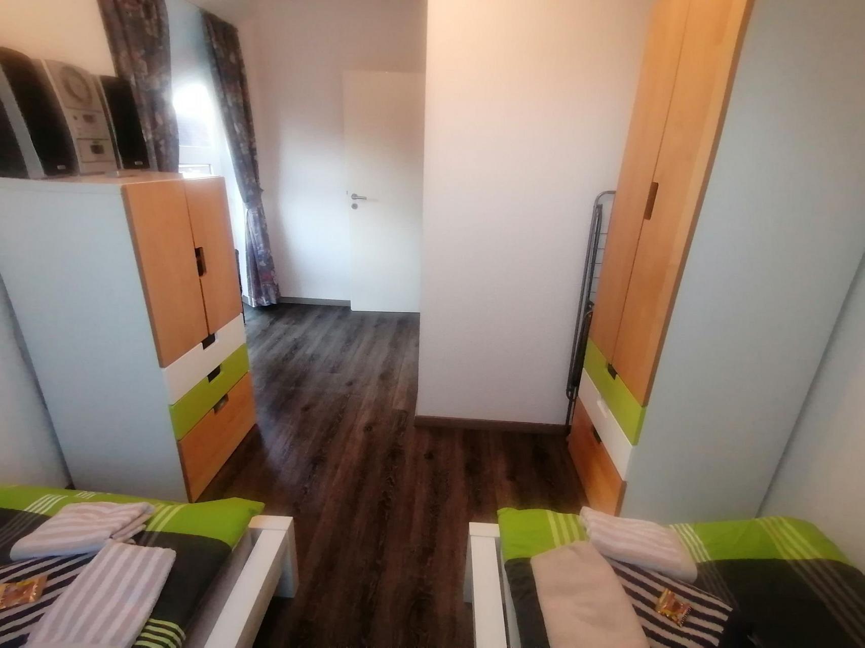1 Schlafzimmer mit zwei Einzelbetten (je 90 x 200 cm), Nachtkonsole mit Nachttischlampe, HiFi-Anlage und Kleiderschrank.