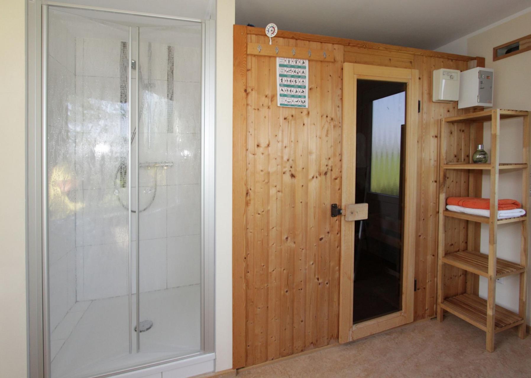 Im Saunabereich befindet sich eine Dusche und ein Ruheraum. Von dort aus haben Sie einen weitläufigem Blick in die Natur.