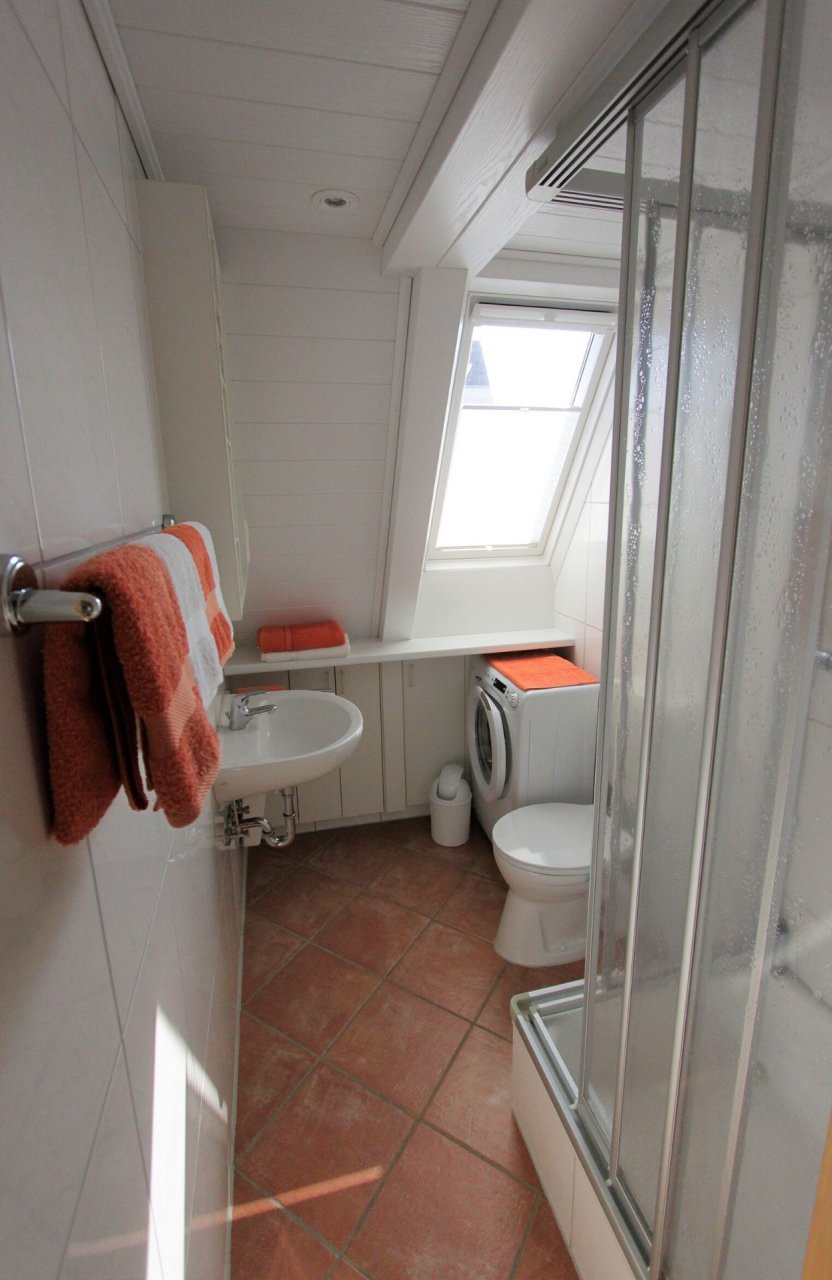 Das Tageslichtduschbad ist mit WC, Dusche, Waschbecken, Handtüchern und Waschmaschine ausgestattet.