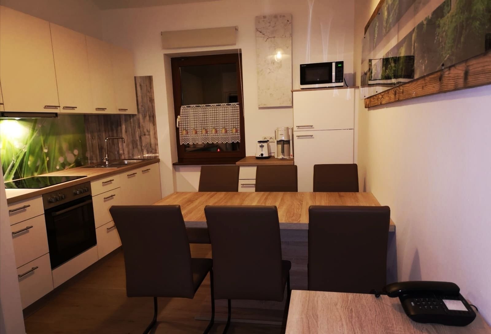 Voll ausgestatteter Küchenbereich mit Kühlschrank, Mikrowelle, Herd und Backofen, Wasserkocher, Filter-Kaffeemaschine und Spülmaschine