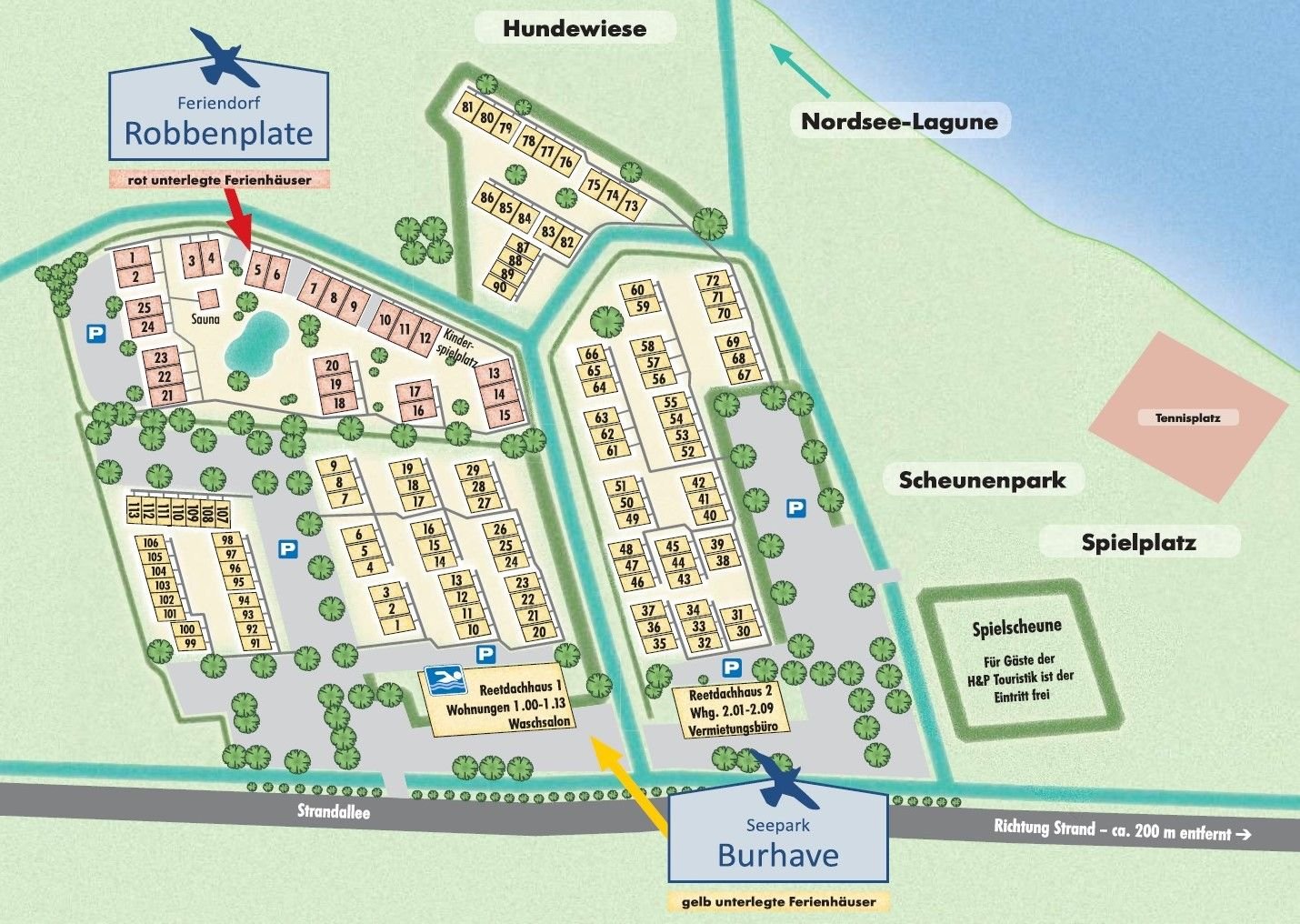 | Der ehemalige Fischerort mit mehr als 2000 Einwohnern lädt zum entspannten oder abenteuerlustigen Familienurlaub ein. Kinder werden hier ganz groß geschrieben. Erkunden Sie das Wattenmeer, nehmen angeführten Wattwanderungen teil, Essen ein leckeres Eis an der Promenade, spielen Minigolf oder leihen sich Fahrräder aus. Auch für Abwechslung bei schlechtem Wetter ist gesorgt. Spielen Sie in der Spielscheune Burhave oder nutzen das Aqua Mundo in Tossens. Verbringen Sie ihren Urlaub in der kinderfreundlichen Ferienanlage von H&P Touristik, nur 200 m von der Nordsee-Lagune, Strand und nebenan liegenden Spielscheune entfernt. Die Ferienunterkünfte befinden sich nur wenige Gehminuten von der Strandpromenade mit Gästeempfang, Restaurants, Eiscafé, Bäcker, Souvenirläden, Fahrrad- und Gokart Verleih entfernt. Als Hausgast haben Sie freien Eintritt für die: Nordseelagune, Spielscheune und Nutzung des anlageneigenen Schwimmbades. |