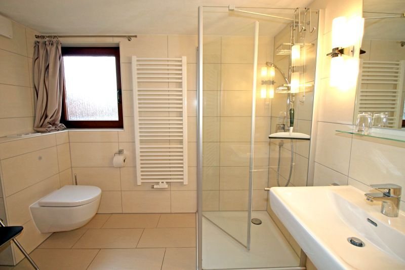 Ein Duschbad mit Toilette, teilweise mit Gäste WC