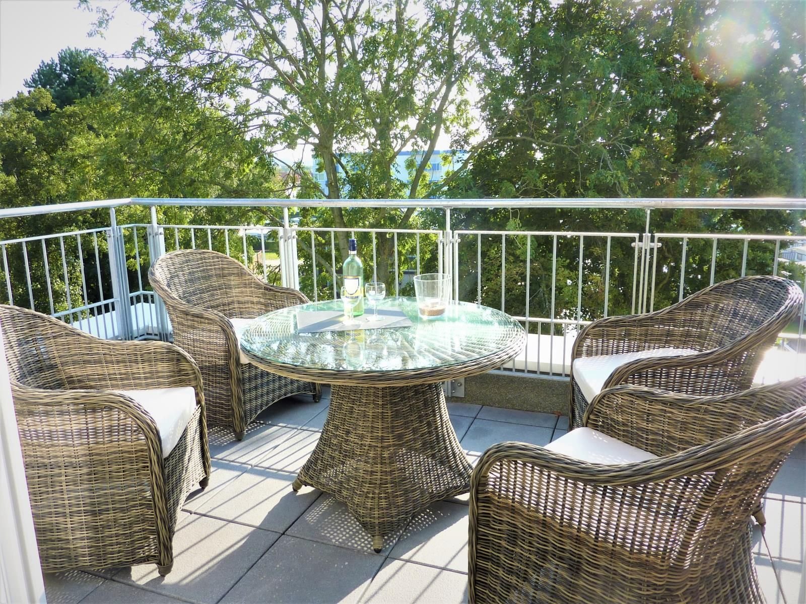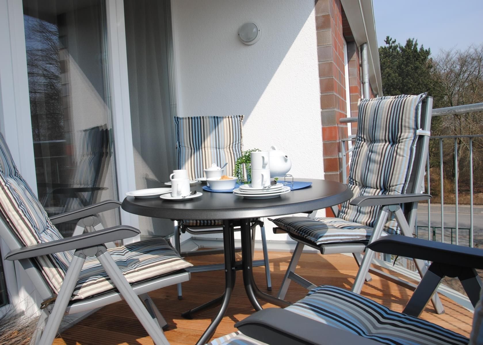 Balkon mit Möbeln und Auflagen
