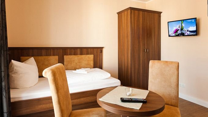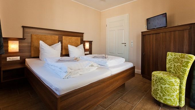 1 Schlafzimmer mit Doppelbett mit LCD-TV und Bettwäsche