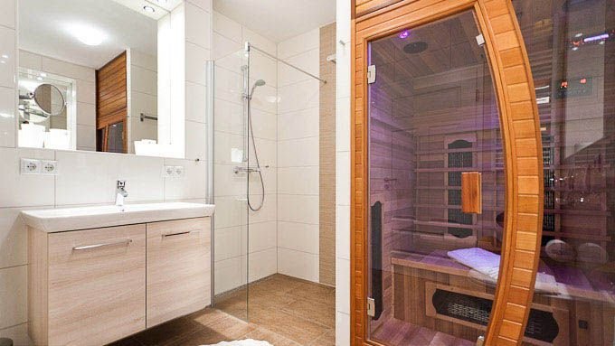 Jede Ferienwohnung hat eine eigene Sauna, W-LAN, Kamin und ist mit einem Fahrstuhl erreichbar.