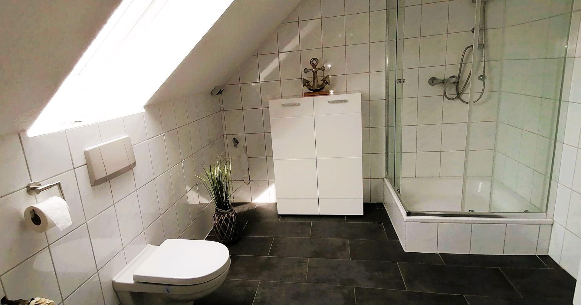Das Badezimmer verfügt über eine Dusche, WC, Waschbecken und ist mit einem Haartrockner ausgestattet.