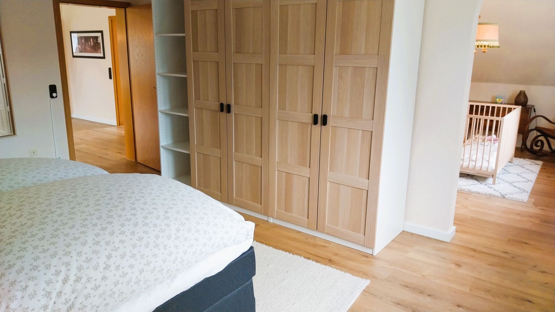 1 Schlafzimmer mit Doppelbett (140 x 200), Kleiderschrank und Babyzimmer mit Gitterbett und Wickelkommode