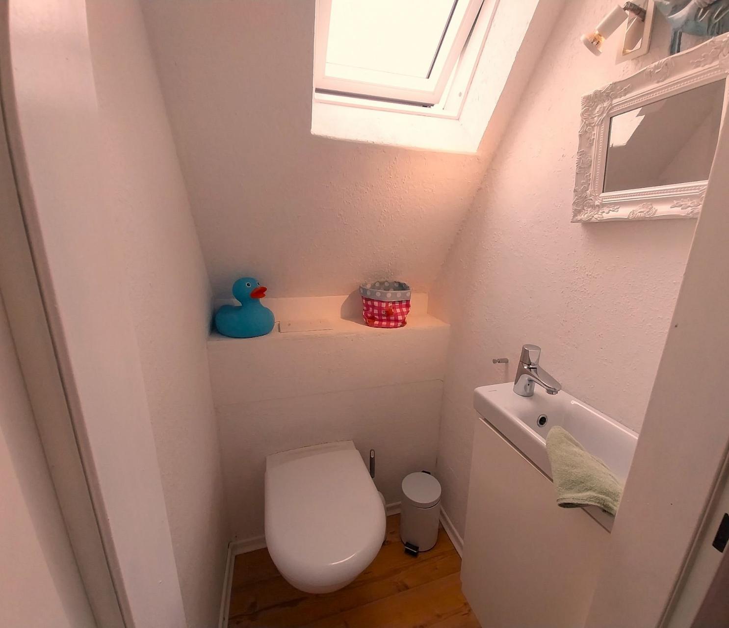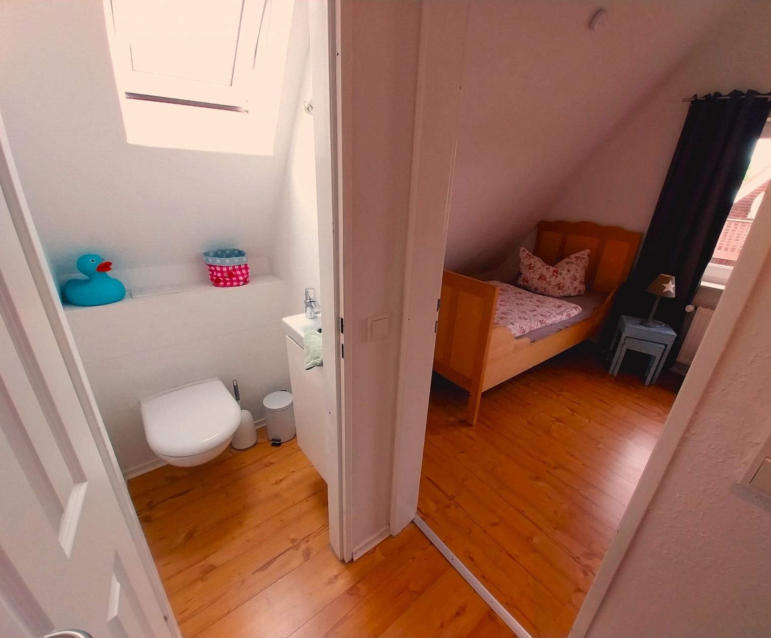 Das Badezimmer mit Dusche und WC befindet sich im Erdgeschoss, im Obergeschoss gib es zusätzlich ein Gäste-WC.