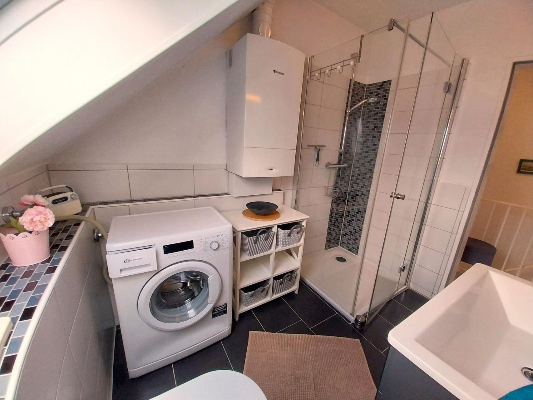 Ebenfalls im Obergeschoss befindet sich das Tageslichtduschbad mit dem WC und einer großen Dusche mit flachem Einstieg. Eine Waschmaschine, ein beleuchteter Spiegelschrank, der Waschtisch mit Schubladen und ein Föhn runden das Wohlgefühl im Badezimmer ab.