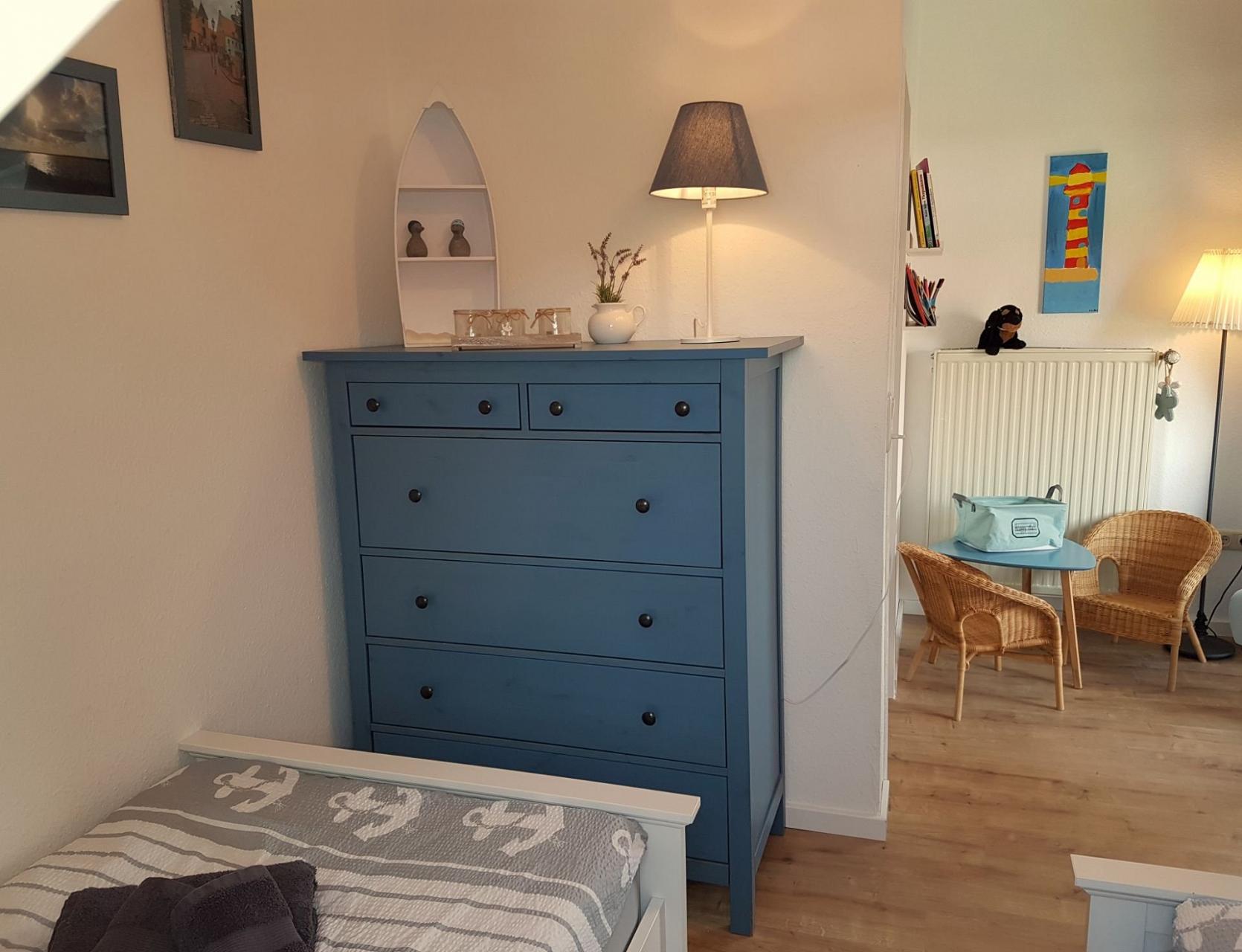 1 Schlafzimmer mit zwei Einzelbetten (je 90 x 200 cm), Nachtkonsole mit Nachttischlampe, Kommode, Lesesessel und gemütliche Kindersitzgruppe.