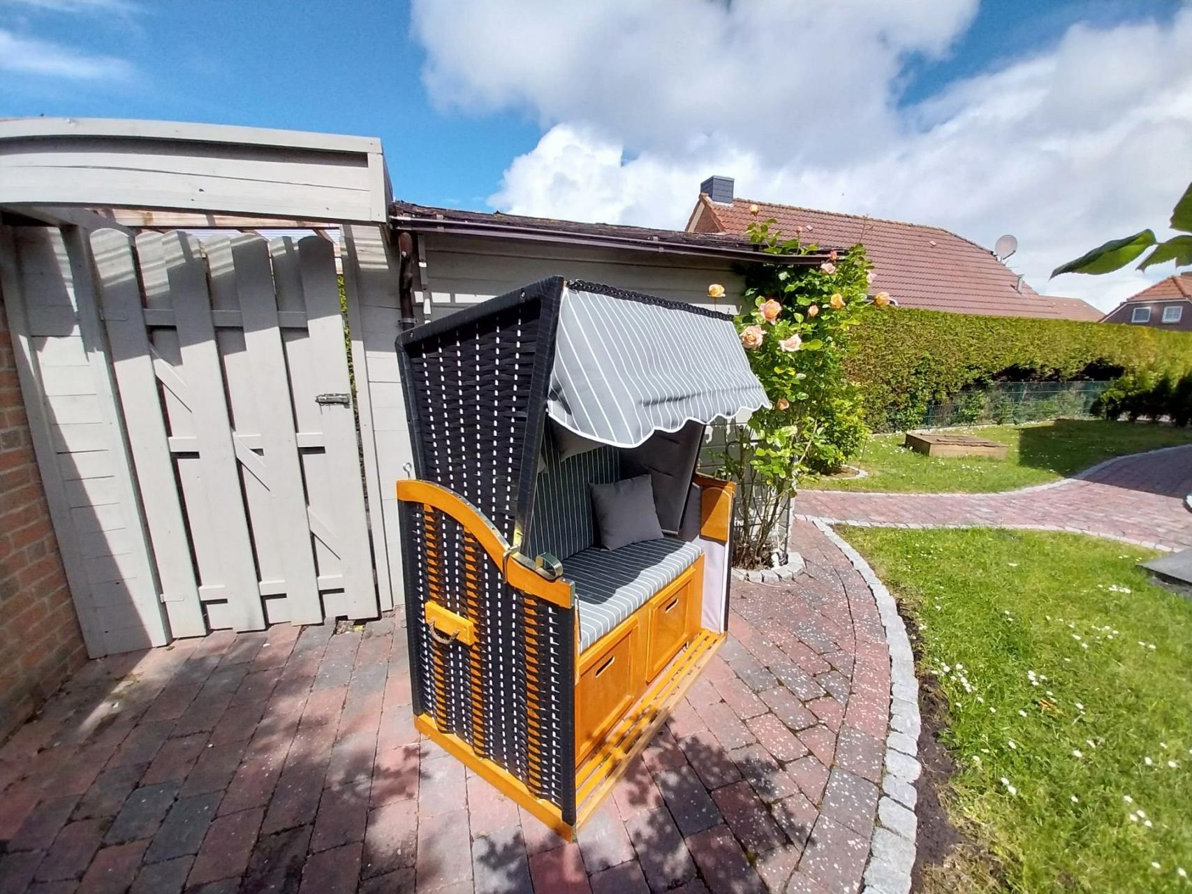 | Vom Wohnbereich gelangen Sie auf die Terrasse (Süd-West-Richtung) und den eingezäunten Garten mit zwei Gartenliegen. Auf den dort ebenfalls verfügbaren Gartenmöbeln können Sie entspannt die Sonne genießen, einen schönen Grillabend verbringen oder mit Ihren Kindern auf der Rasenfläche spielen. |