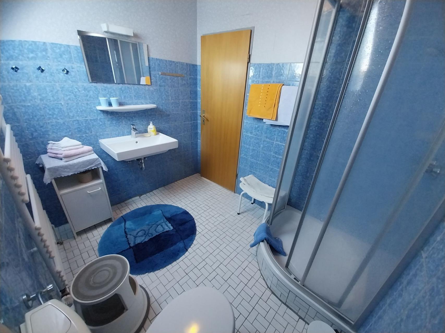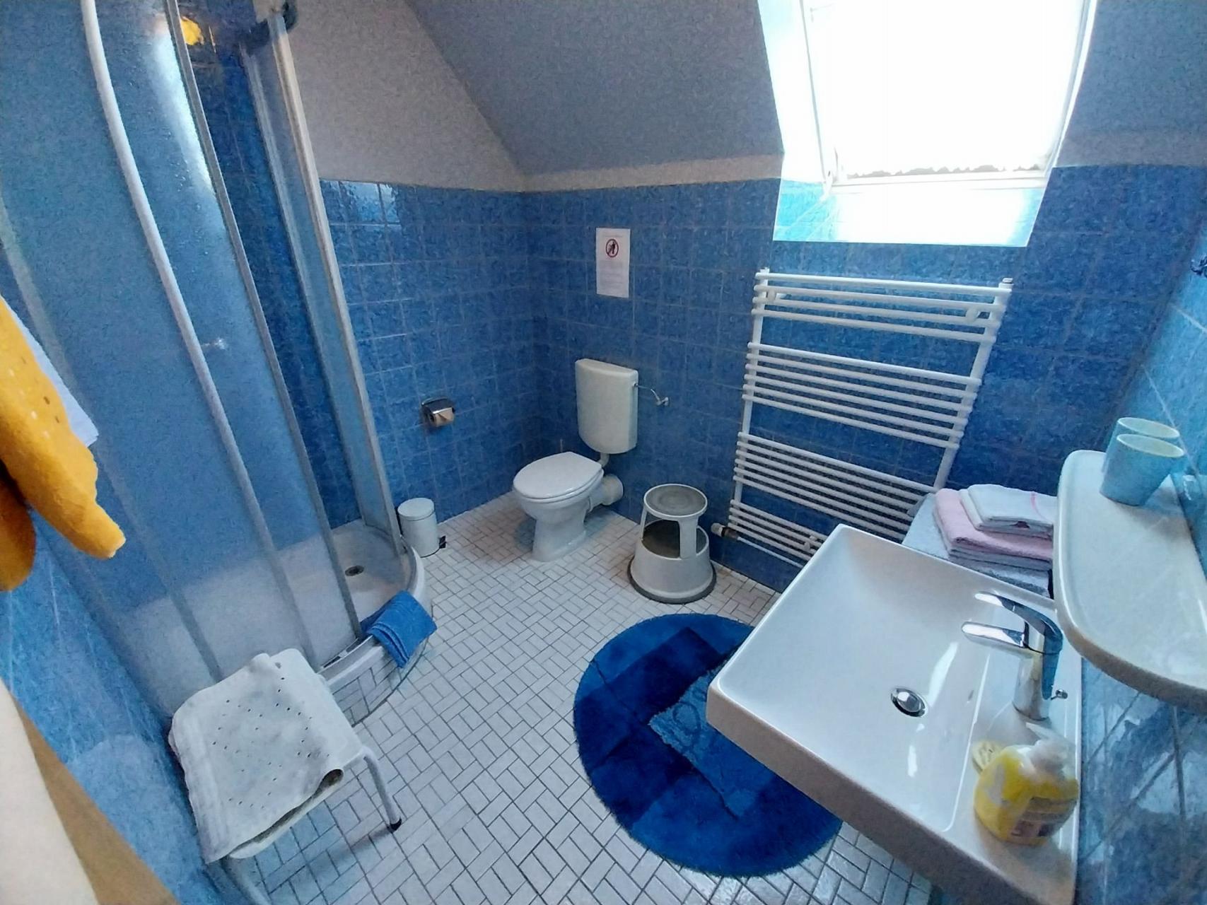 Dusche, WC, Waschbecken und Handtuchheizkörper