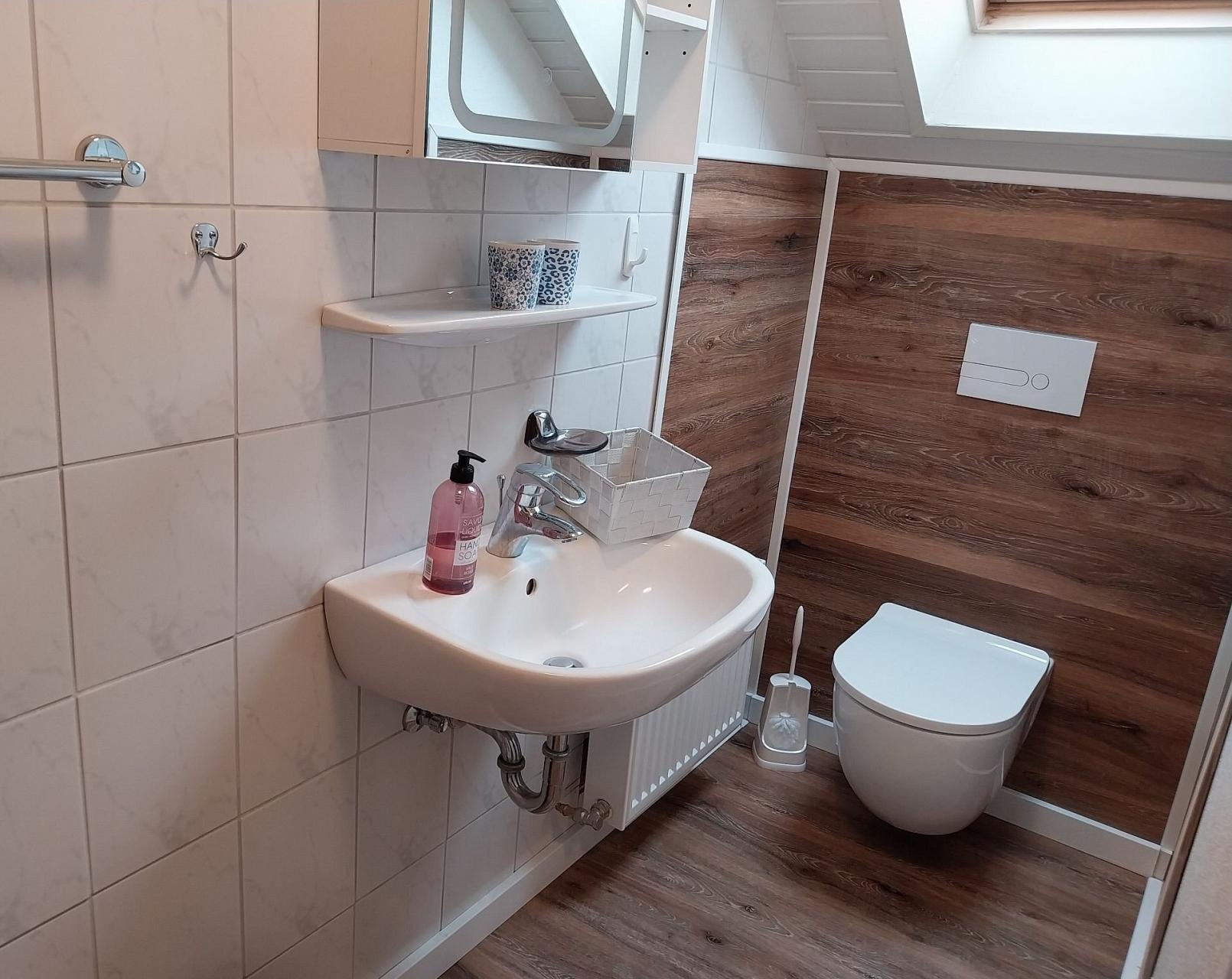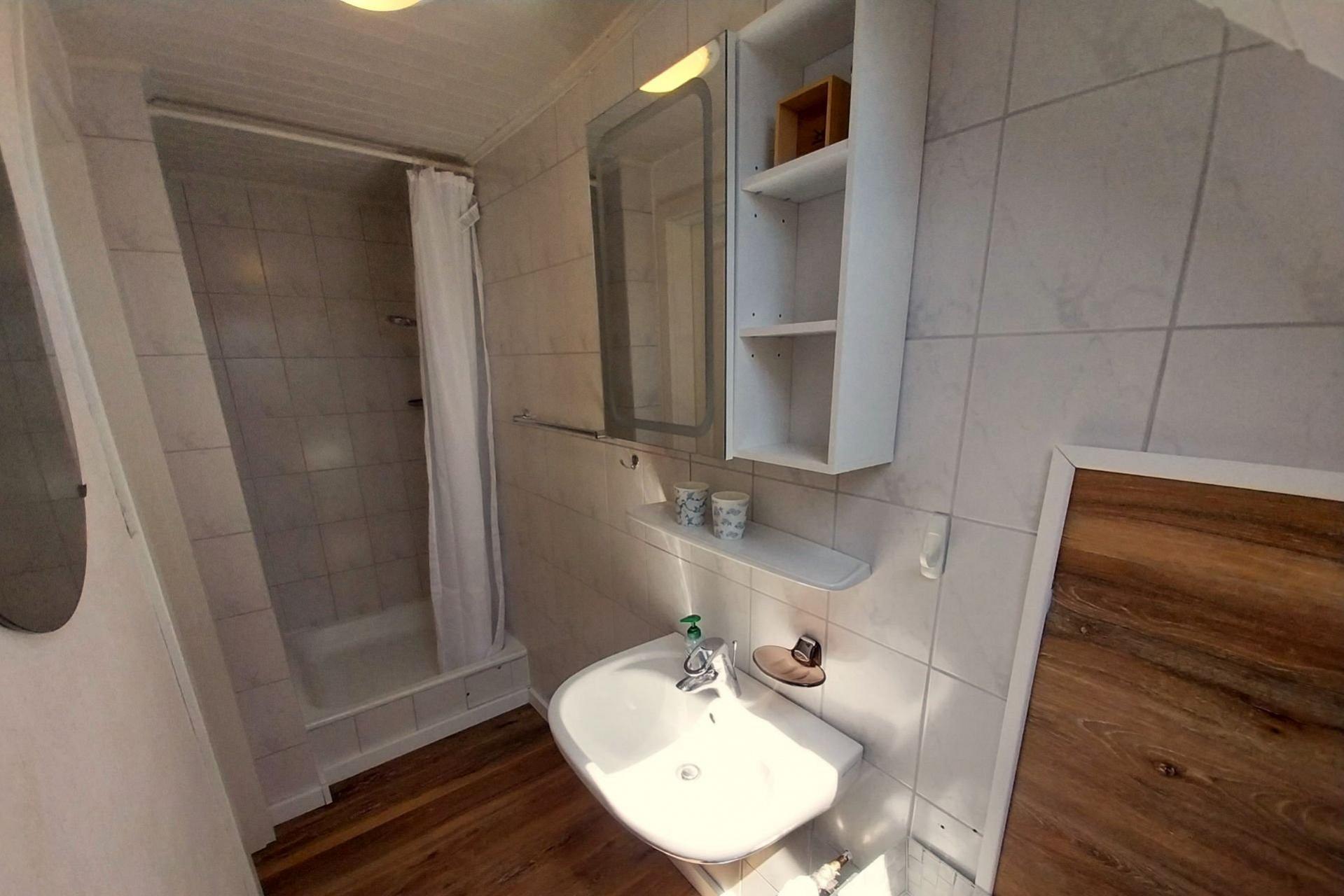 Vom Schlafzimmer führt eine Tür in das Tageslicht-Bad mit Dusche. Ein Spiegel, ein Waschtisch sowie ein Hängeschrank für die Unterbringung Ihrer persönlichen Dinge runden das Wohlgefühl im Badezimmer ab.