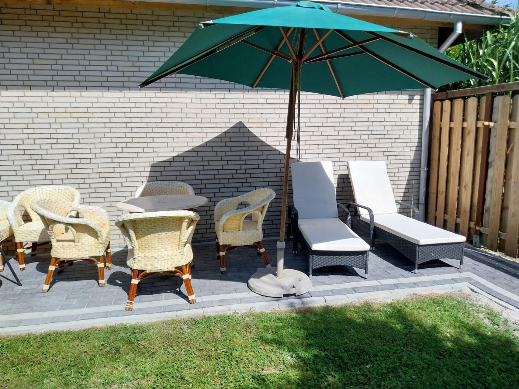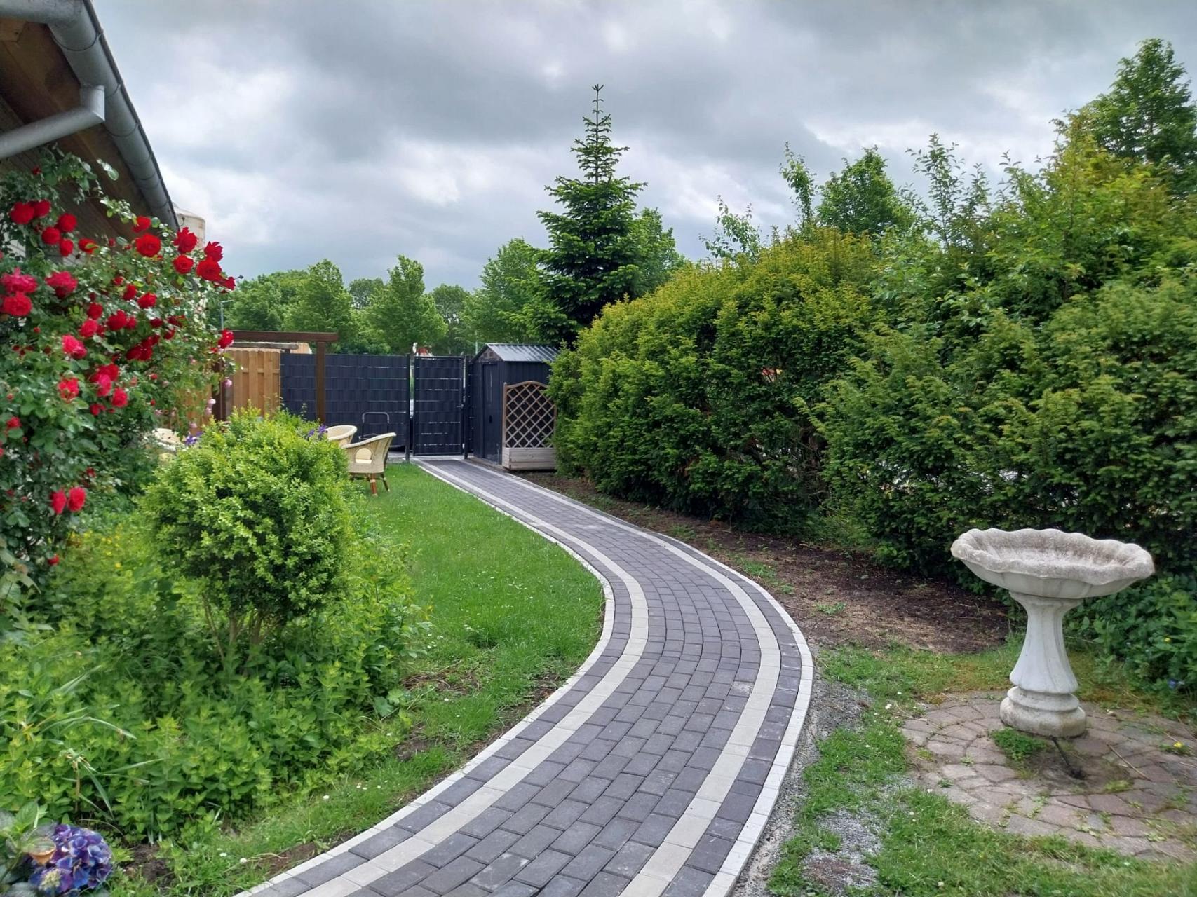 | Im eigens für Gäste reservierten Gartenbereich (wird zurzeit noch Angelegt) rechts des Haupteingangs finden Sie eine überdachte Terrasse (Süd-West-Richtung). Auf den dort verfügbaren Gartenmöbeln können Sie an entspannten Tagen und Abenden die Sonne genießen, oder einen schönen Grillabend verbringen. Sonstiges: Ein Parkplatz ist direkt an der Unterkunft kostenfrei verfügbar. Vor dem Haus befindet sich ein abschließbarer Fahrradschuppen mit Stromanschluss Bitte beachten: Die Außenanlage befindet sich aktuell noch in der Fertigstellungsphase! |