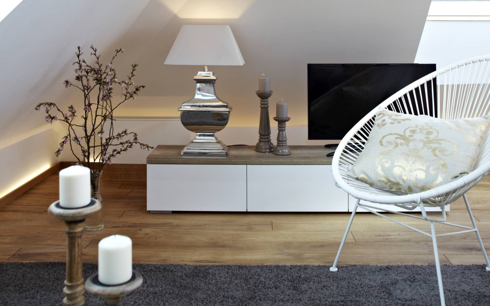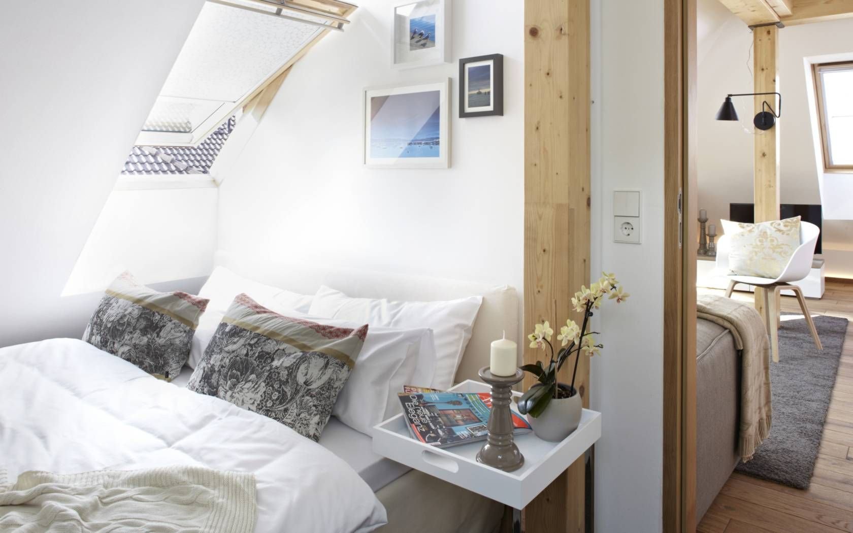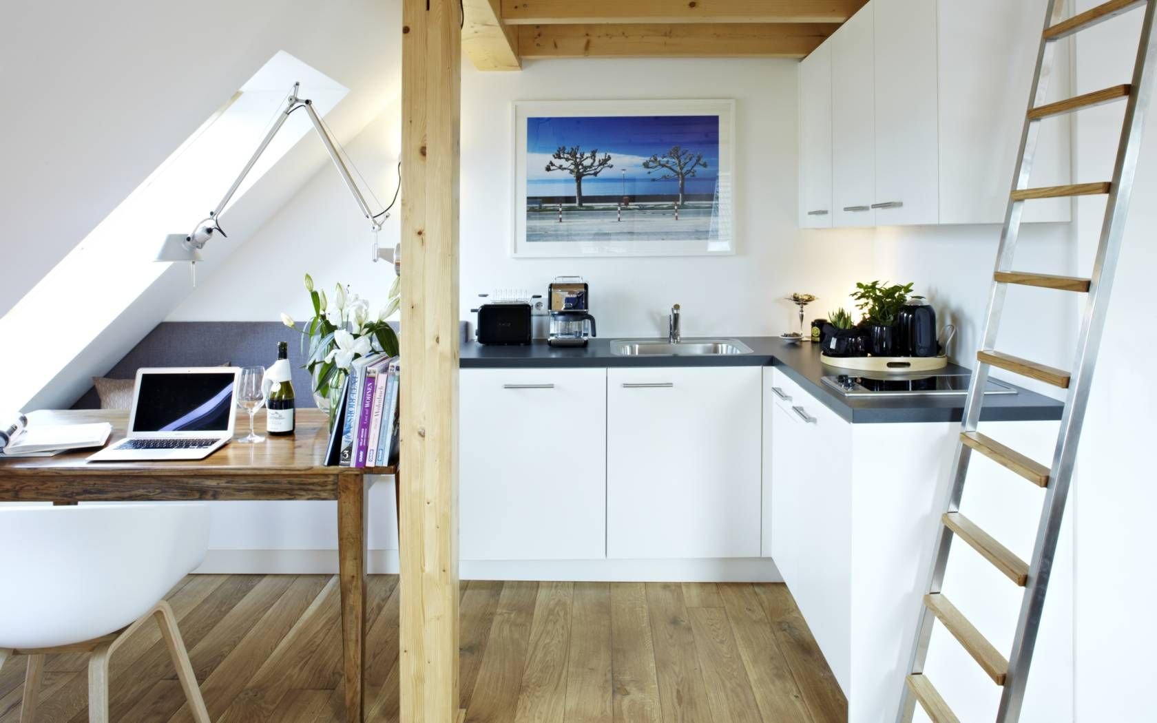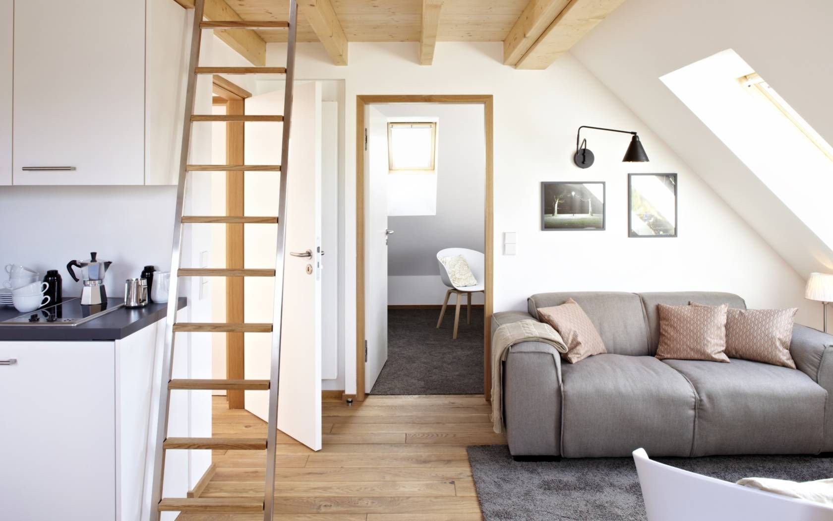 Ein von Licht durchfluteter Wohnraum ist das Herz dieser großen Dachwohnung. Bei klarem Wetter sieht man bis zum Säntis. Der Tag klingt mit Blick auf die schönsten Sonnenuntergänge aus und in dem heimeligen Schlafzimmer kann man unterm Sternenhimmel einschlafen. Die perfekt ausgestattete Küche wird von einer gemütlichen Bank flankiert. Am antiken Teakholztisch kann man lesen, arbeiten, essen.