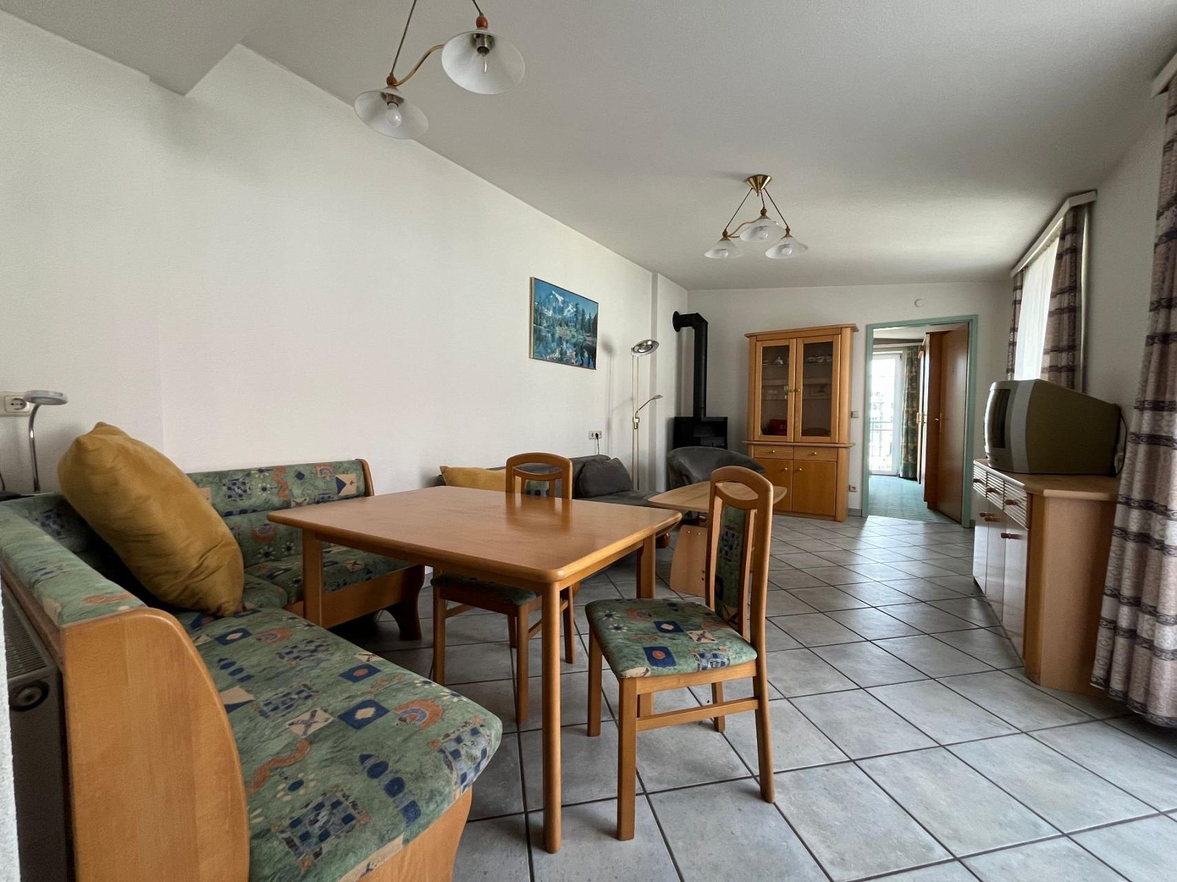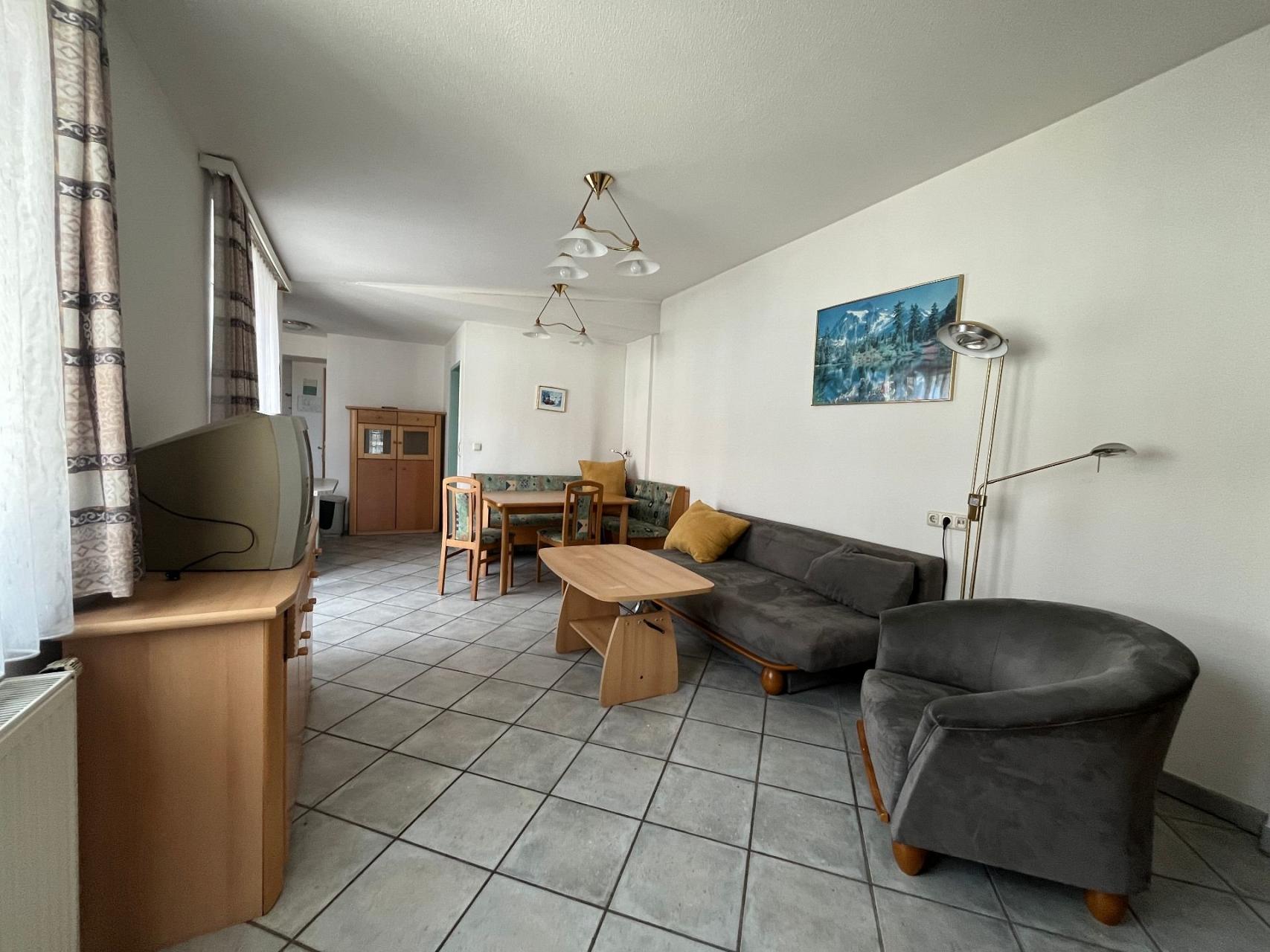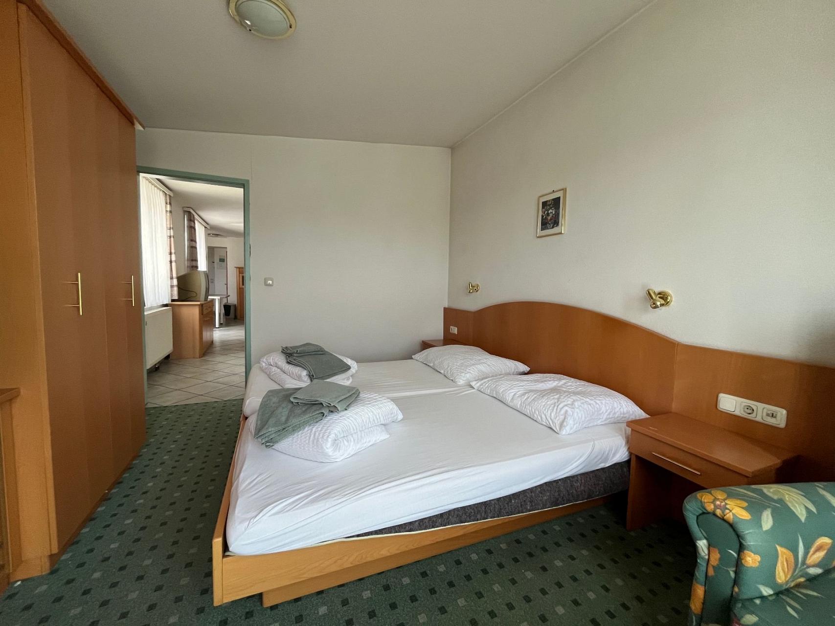 Unser Luxus-Apartment: Ihr besonders großes und schönes 2-Zimmer Apartment Nr. 210 im 1. Stock (getrenntes Wohn-/Schlafzimmer ist ausgestattet mit Doppelbett (King-Size) sowie einer bequemen Schlafcouch für die 3. Person, zusätzlich Schreibtisch, TV, WLAN, Duschbad/WC und großer, separater Küche.