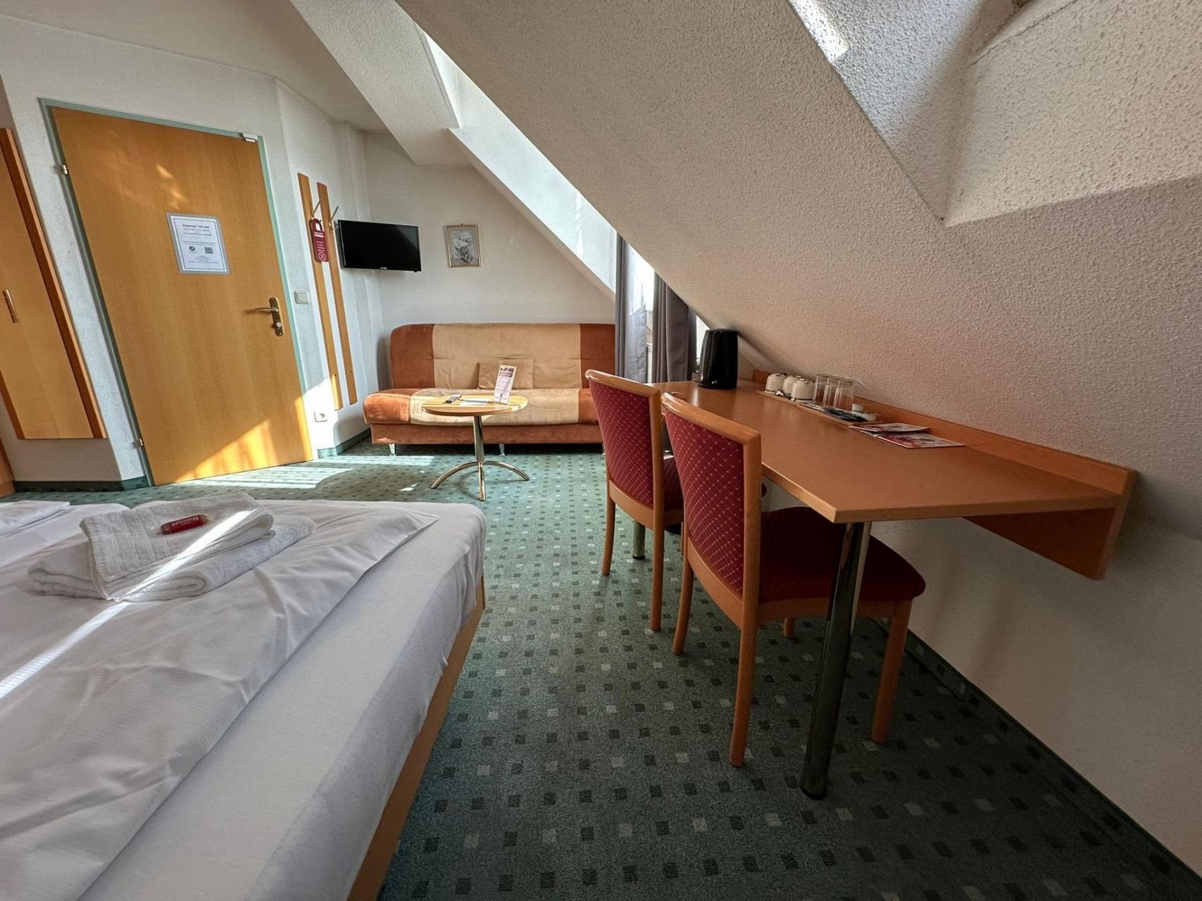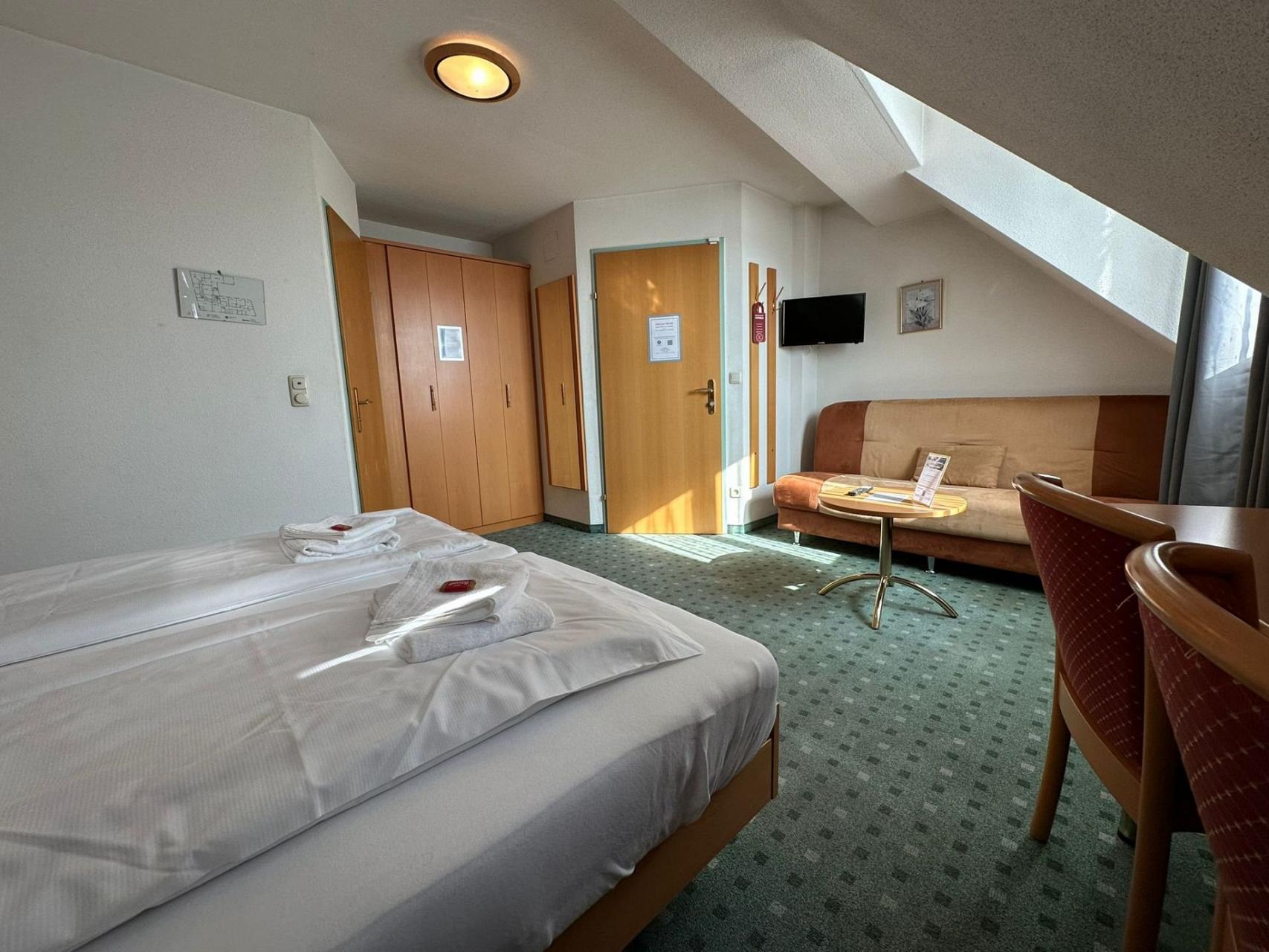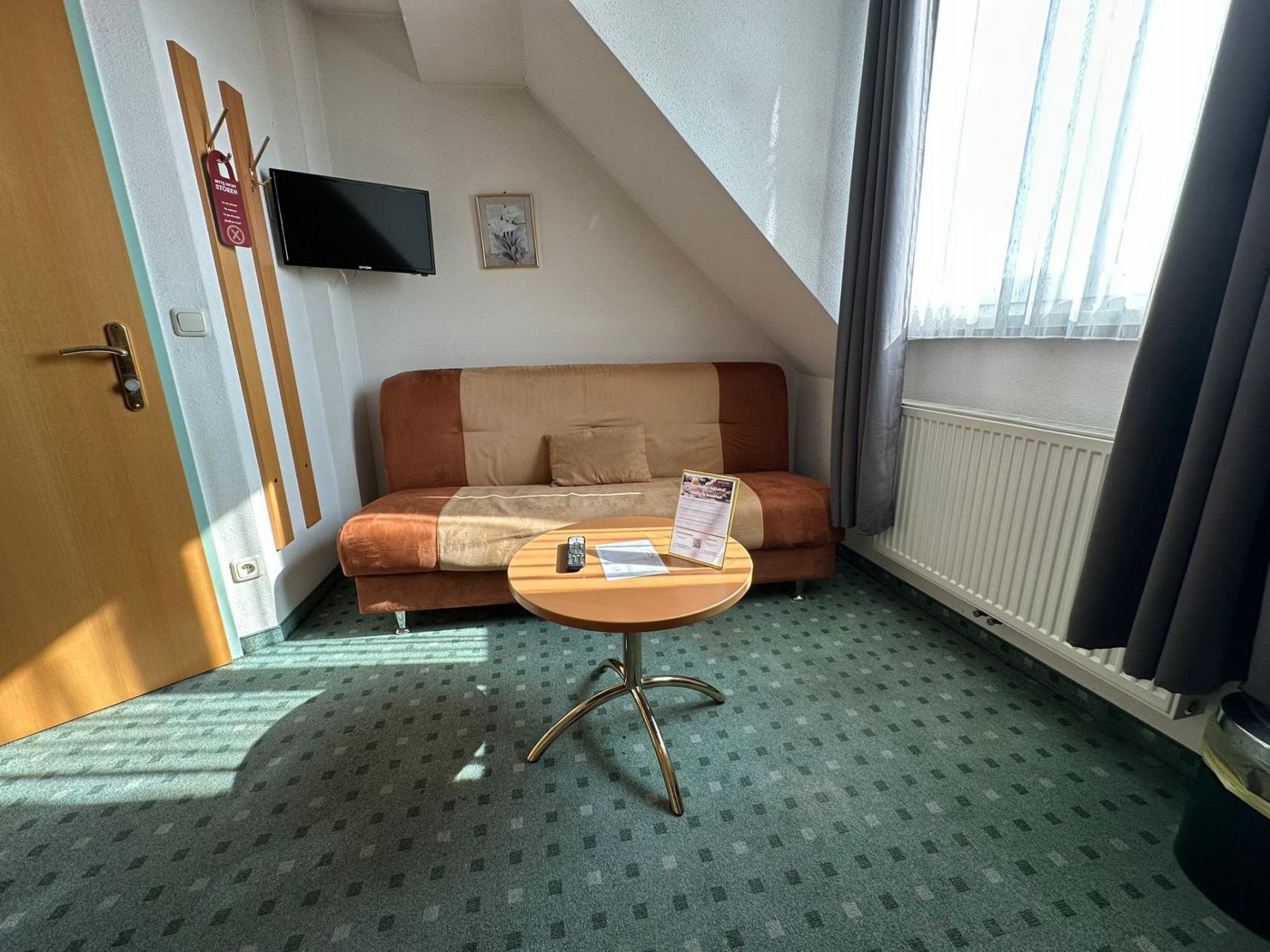 Ihr großes Doppelzimmer Nr. 211 im 2. Stock ist ausgestattet mit einem Doppelbett (Kingsize), bequeme Schlafcouch für eine 3. Person, TV, Schreibtisch, WLAN, Duschbad/WC.