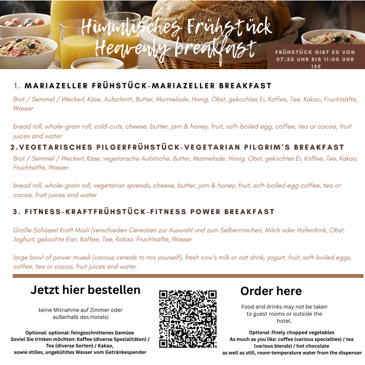 Of course, you can also order your breakfast by phone at +43-664-1008458, by email to rezeption@aparthotel-mariazellerhof.at, or in person at reception.