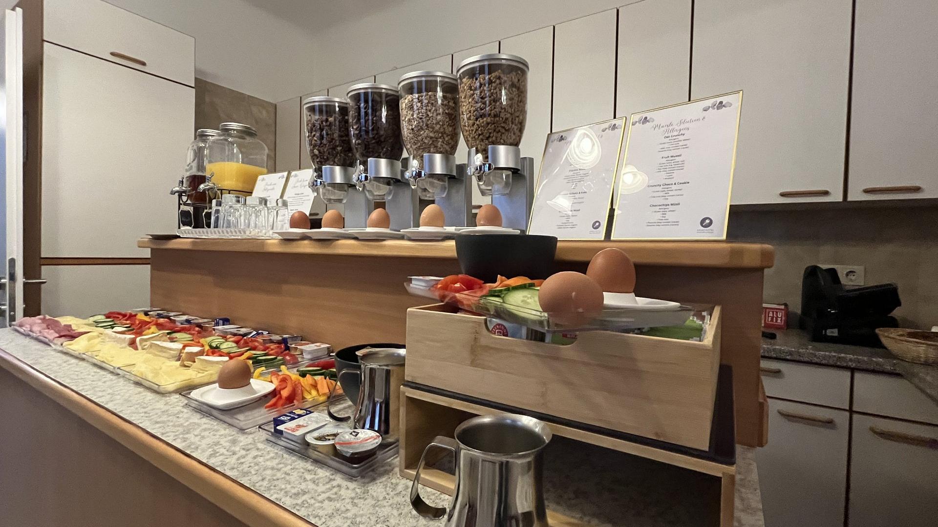 (Large bowl of power muesli (various cereals for mixing yourself), fresh cow's milk or oat milk, finely chopped vegetable sticks, fruit, yogurt, 2 soft-boiled eggs, coffee, tea, hot chocolate, fruit juices, water)