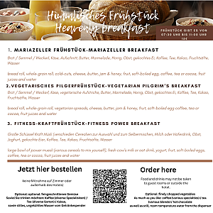 (2 warme Semmeln, Vollkornweckerl, Käse, vegetarische Aufstriche, Butter, Marmelade, Honig, fein geschnittenes Gemüse, Obst, 1 weiches Ei. Kaffee, Tee, Kakao, Fruchtsäfte, Wasser)