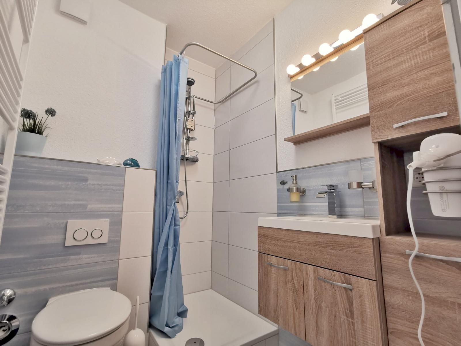 Die Wohnung verfügt über 1 großes Zimmer, mit Wohnbereich, Schlafbereich, einer Küche, einem Bad mit Dusche und einem Balkon. Die Wohnung ist offen, hell und modern gehalten.