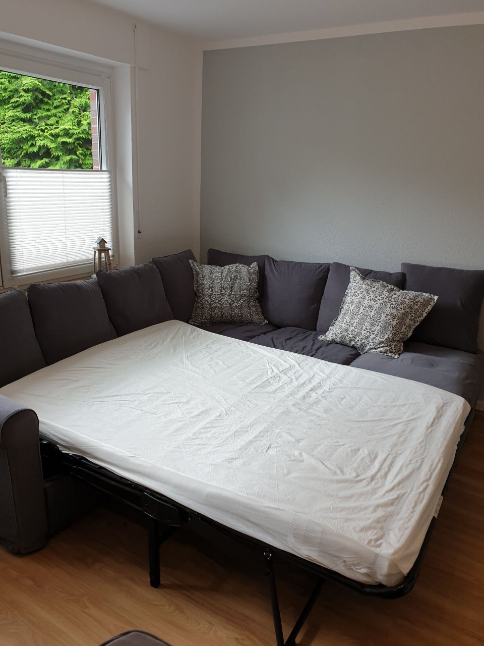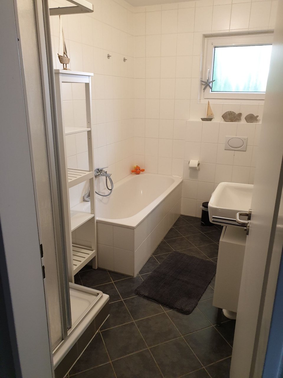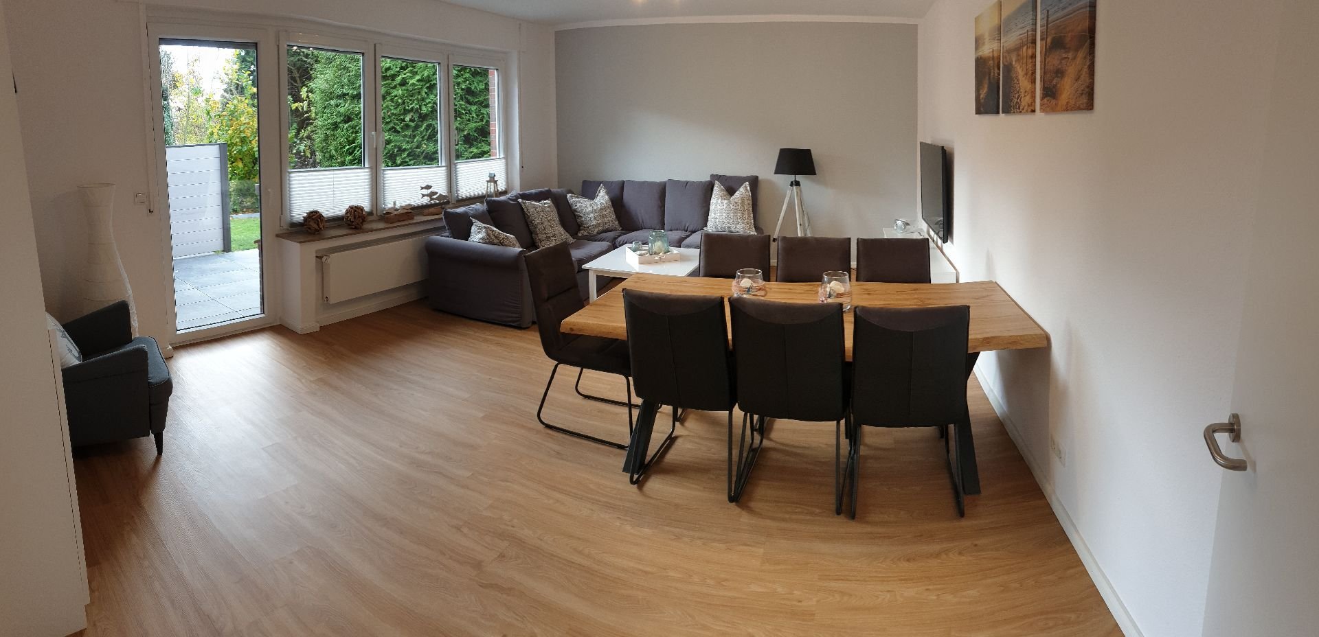 Die moderne Ferienwohnung mit einer Wohnfläche von ca. 97 m², für max. 8 Personen liegt im Erdgeschoss eines Zweifamilienhauses in einer Sackgasse. Sie liegt nur wenige Minuten vom Meer, Strand, Hafen, Einkaufsmöglichkeiten und Schwimmbad entfernt. Sie verfügt über 3 Schlafzimmer die wie folgt aufgeteilt sind: Ein großes Elternschlafzimmer mit einem Boxspringbett 180x200 cm Bett und einem Kinderbett. Das zweite Schlafzimmer hat ein 160x200 cm großes Bett und das dritte Schlafzimmer hat ein Ausziehbett das sich von 90x200 auf 180x200 auf einer zweiten Ebene erweitern lässt. Im Wohnzimmer befindet sich zusätzlich ein Schlafsofa 140x200 cm, welches für zwei weitere Personen eine Schlafmöglichkeit bietet. Die Küche ist von dem großen Wohnzimmer abgetrennt. Es ist ein Gäste-WC und ein Badezimmer mit Dusche und Badewanne vorhanden. Im Abstellraum finden Sie eine Waschmaschine.