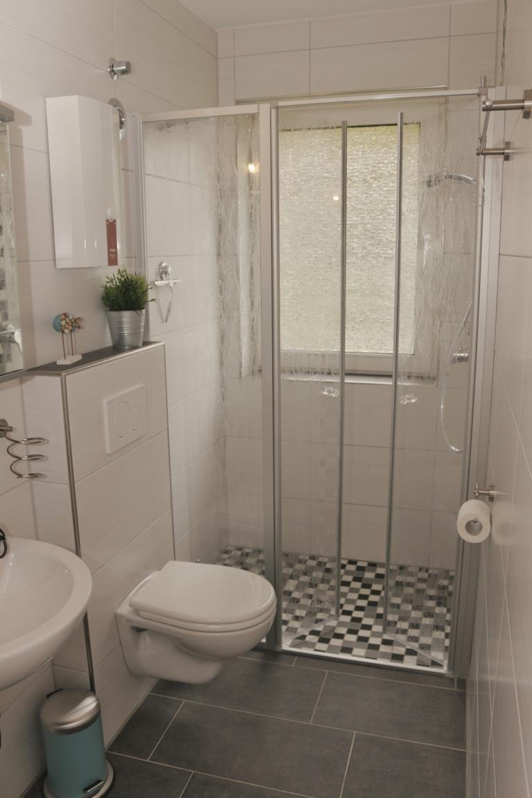 Im Tageslichtbad befindet sich eine ebenerdige moderne Dusche, WC, Waschbecken und Spiegelschrank.