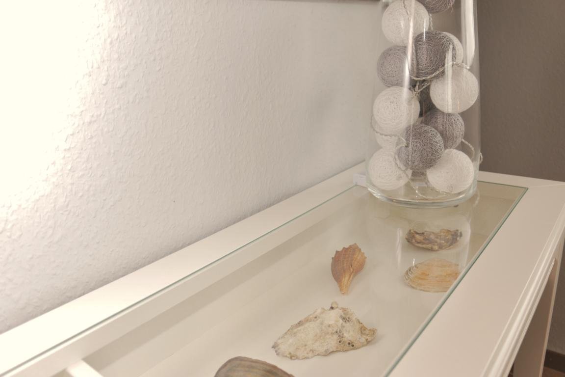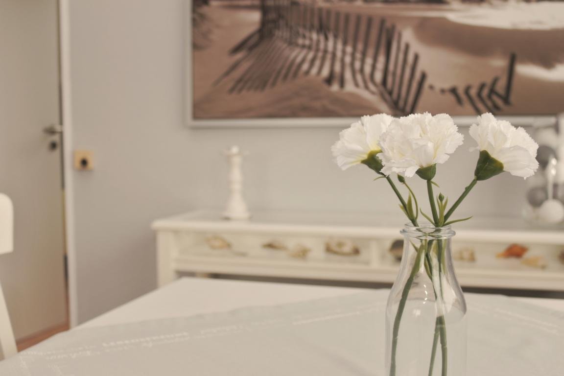 Die Küche ist ausgestattet, mit Herd, Backofen, Kühlschrank, Mikrowelle und allem was in einer Ferienunterkunft benötigt wird. Am Esstisch finden 2 Personen Platz. Vom Wohn/ Essbereich geht es auf den Balkon mit direktem Blick auf den Strand.