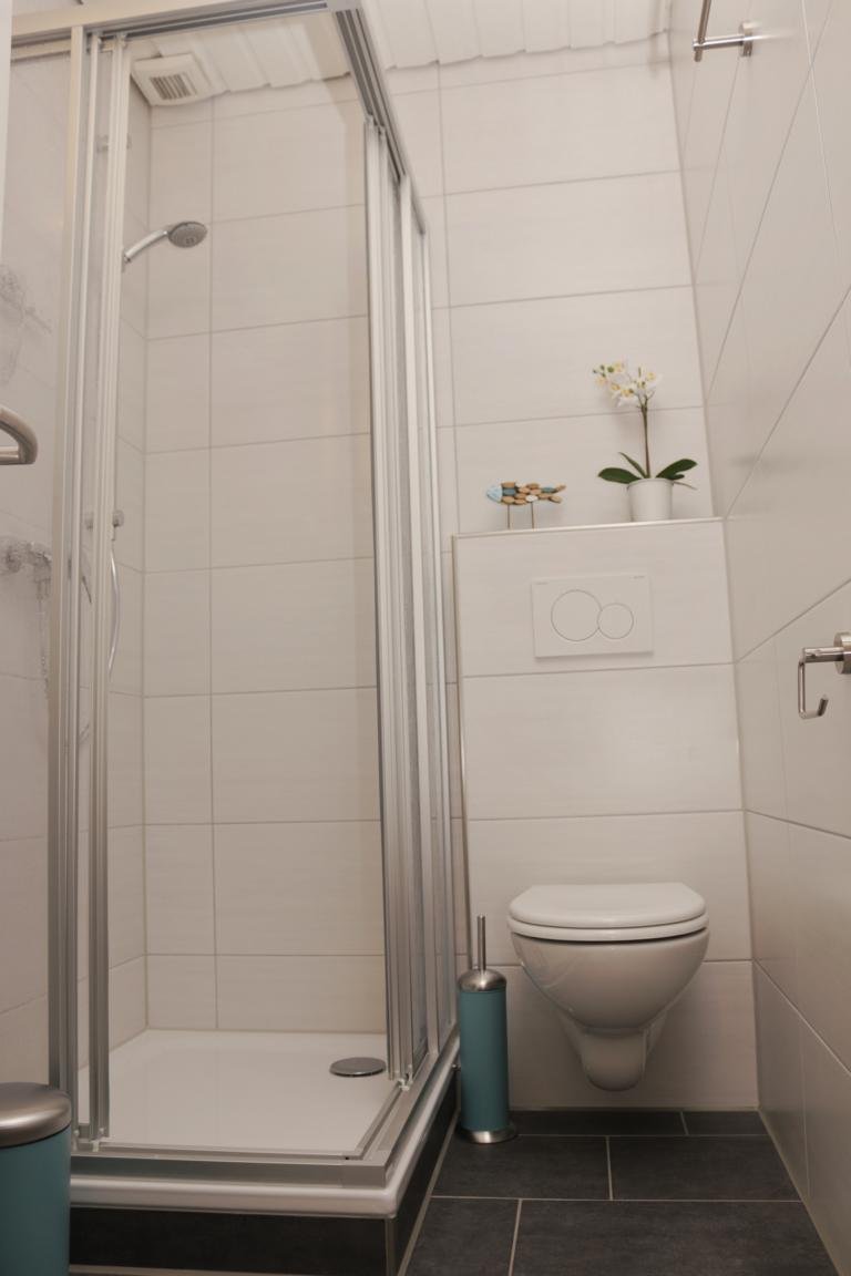 Im modernen Badezimmer befindet sich eine Dusche, WC, Waschbecken und Spiegelschrank.