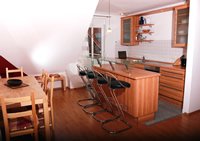 Die Küchenzeile mit Esstresen ist mit Ceranfeld, Herd, Kaffeemaschine, Toaster, Mikrowelle und sämtlichen Zubehör ausgestattet.