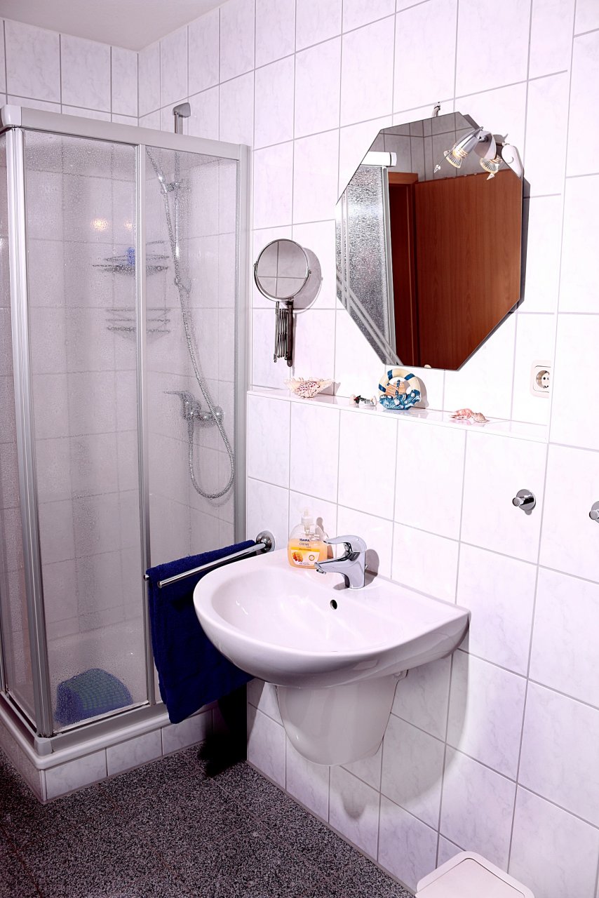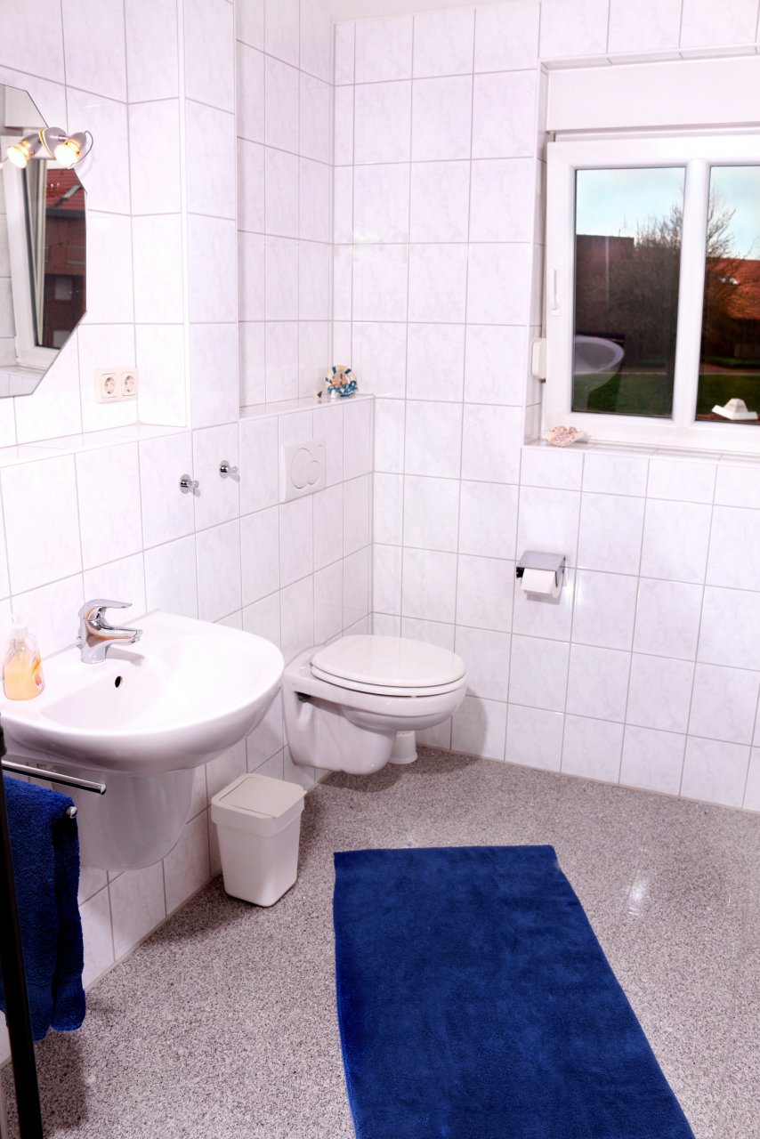 Auf der ersten Ebene befindet sich das große Tageslichtbad mit Dusche, WC, Waschbecken und Fussbodenheizung.