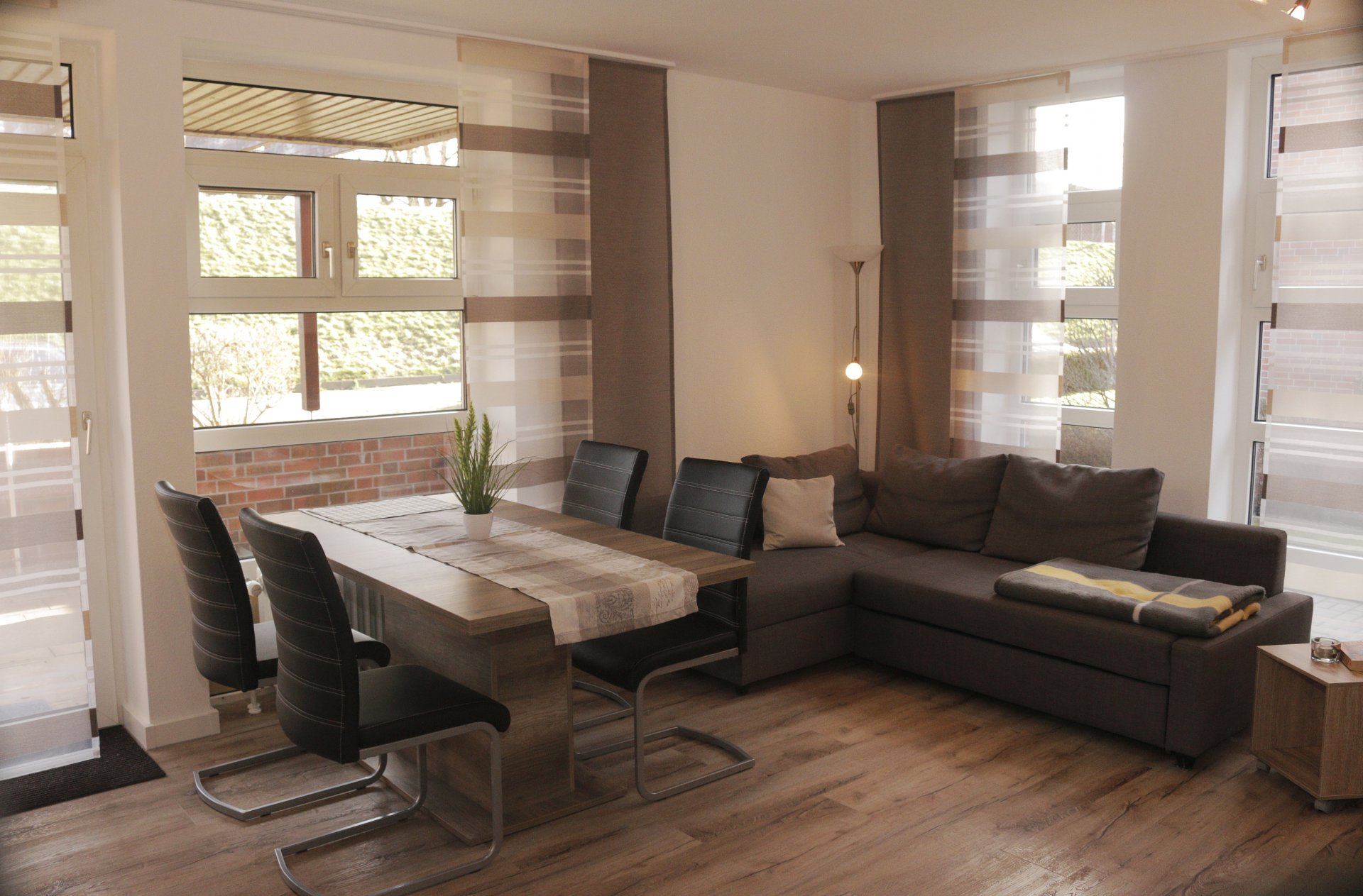 Herzlich Willkommen in unserer Ferienwohnung im Strandweg 11b - Erdgeschoss. Diese neu renovierte Ferienwohnung ist im März 2017 fertiggestellt worden und wird ab sofort als Ihr Feriendomizil angeboten. Auf ca. 60 m² bietet diese ausreichend Platz für 3 Personen. Im 1. Schlafzimmer befindet sich ein Doppelbett mit passenden Nachtkonsolen und ein großzügiger Kleiderschrank. Das zweite Schlafzimmer bietet ebenfalls einen großen, geräumigen Kleiderschrank und ein Einzelbett. Das neu gestaltete Badezimmer ist mit einer ebenerdigen Dusche ausgestattet. Die üblichen Einrichtungen wie WC - Waschbecken - Spiegel und Handtuchtrockner finden hier auch Ihren Platz. Die große Küchenzeile bietet Ihnen einen großen Kühlschrank ein separates Gefrierfach. Ceranfeld mit Umluft-Backofen, alle gängigen Küchengeräte wie Kaffeemaschine (Filter & Pad), Wasserkocher, Toaster und Mikrowelle. Um das schmutzige Geschirr kümmert sich eine Spülmaschine. Der gemütliche Wohnbereich ist mit Eck-Couch und einer Kommode auf der ein Flachbild - TV Platz findet, ausgestattet. Auf der Terrasse haben wir einen Tisch mit 4 Stühlen bereitstehen.