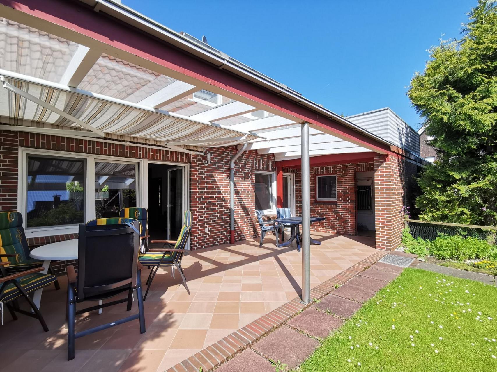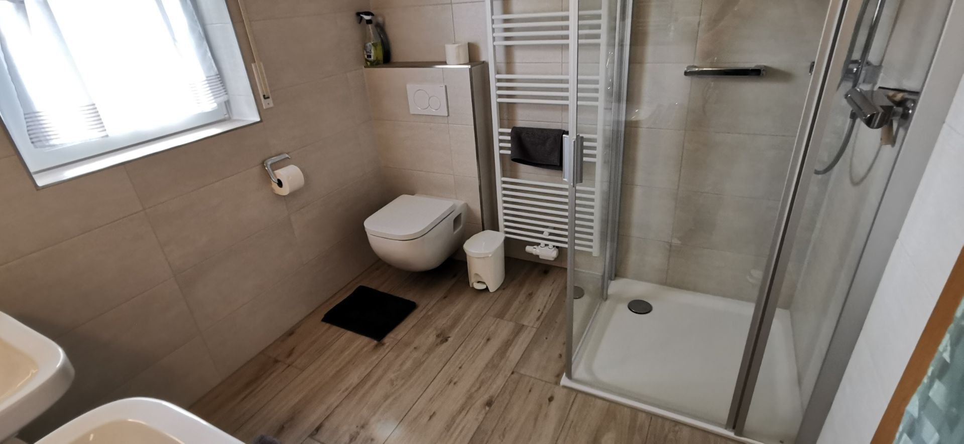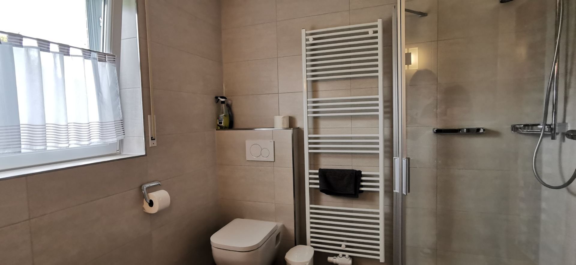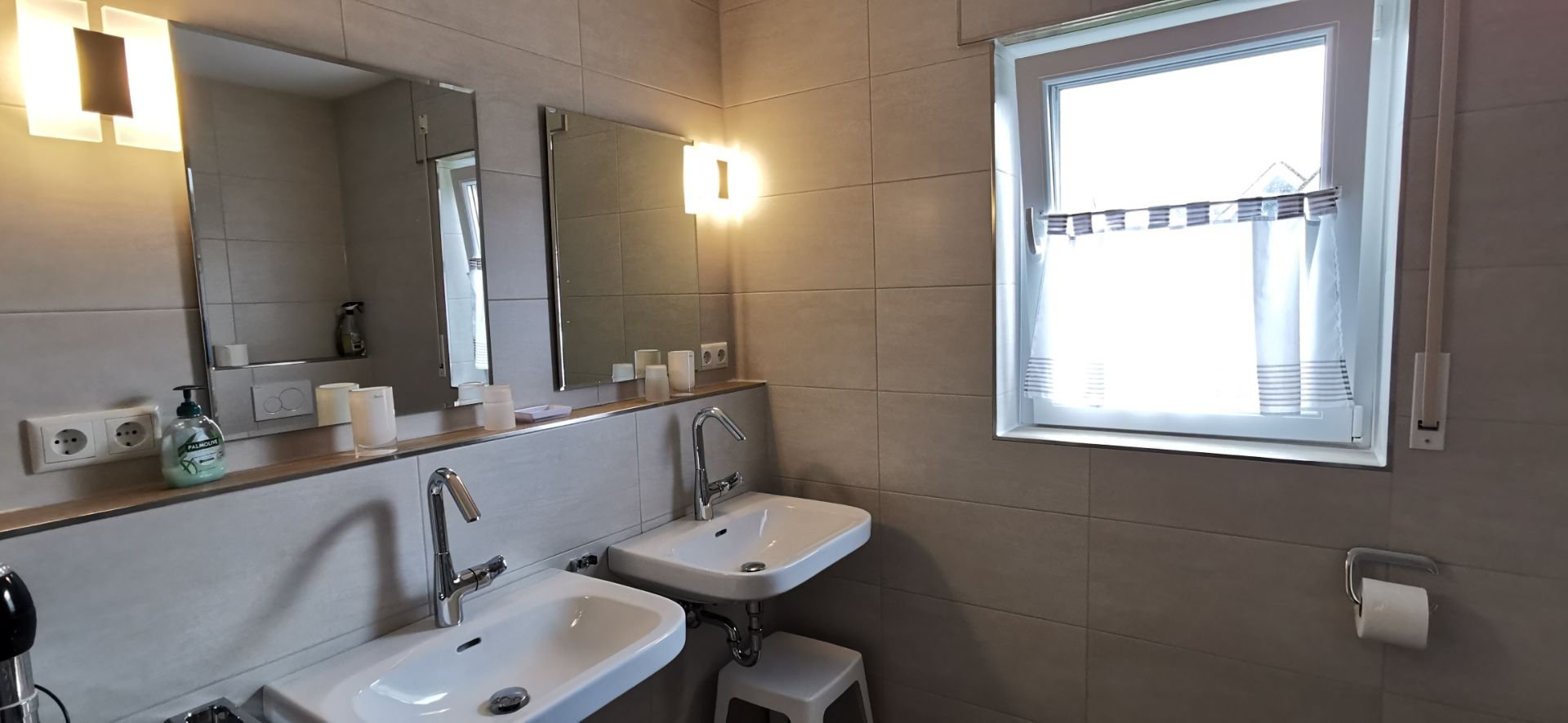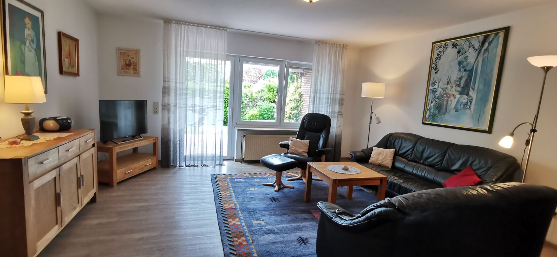 große Ferienwohnung für 6 Personen in zentraler Lage, 3 Schlafzimmer, sehr großer Wohnraum mit angrenzender Küche, großer Esstisch, Spülmaschine, Backofen, Duschbad mit WC, separates WC, große Überdachte Terrasse, Waschmaschine und Trockner im Haus, PKW-Stellplatz, Garten