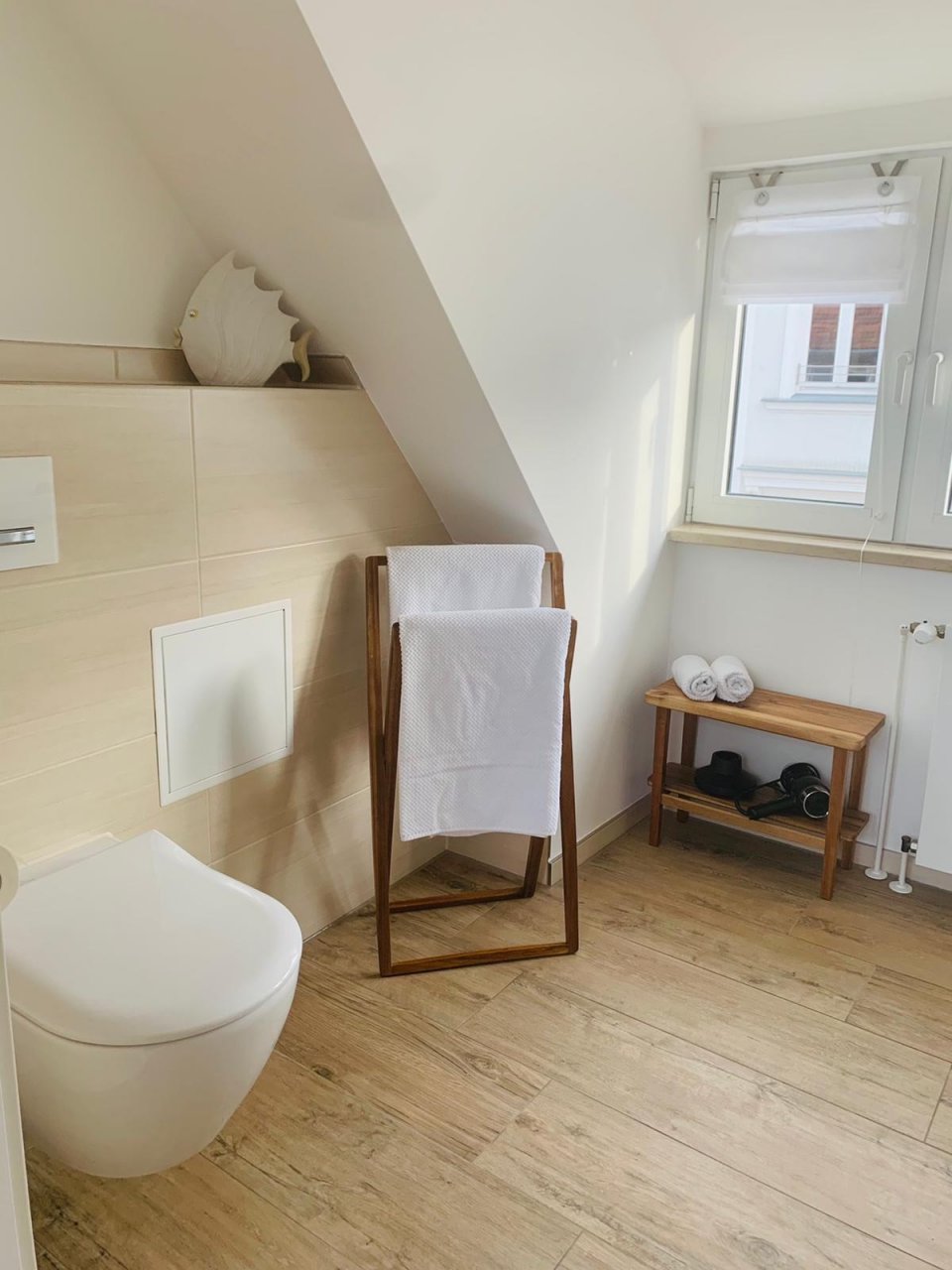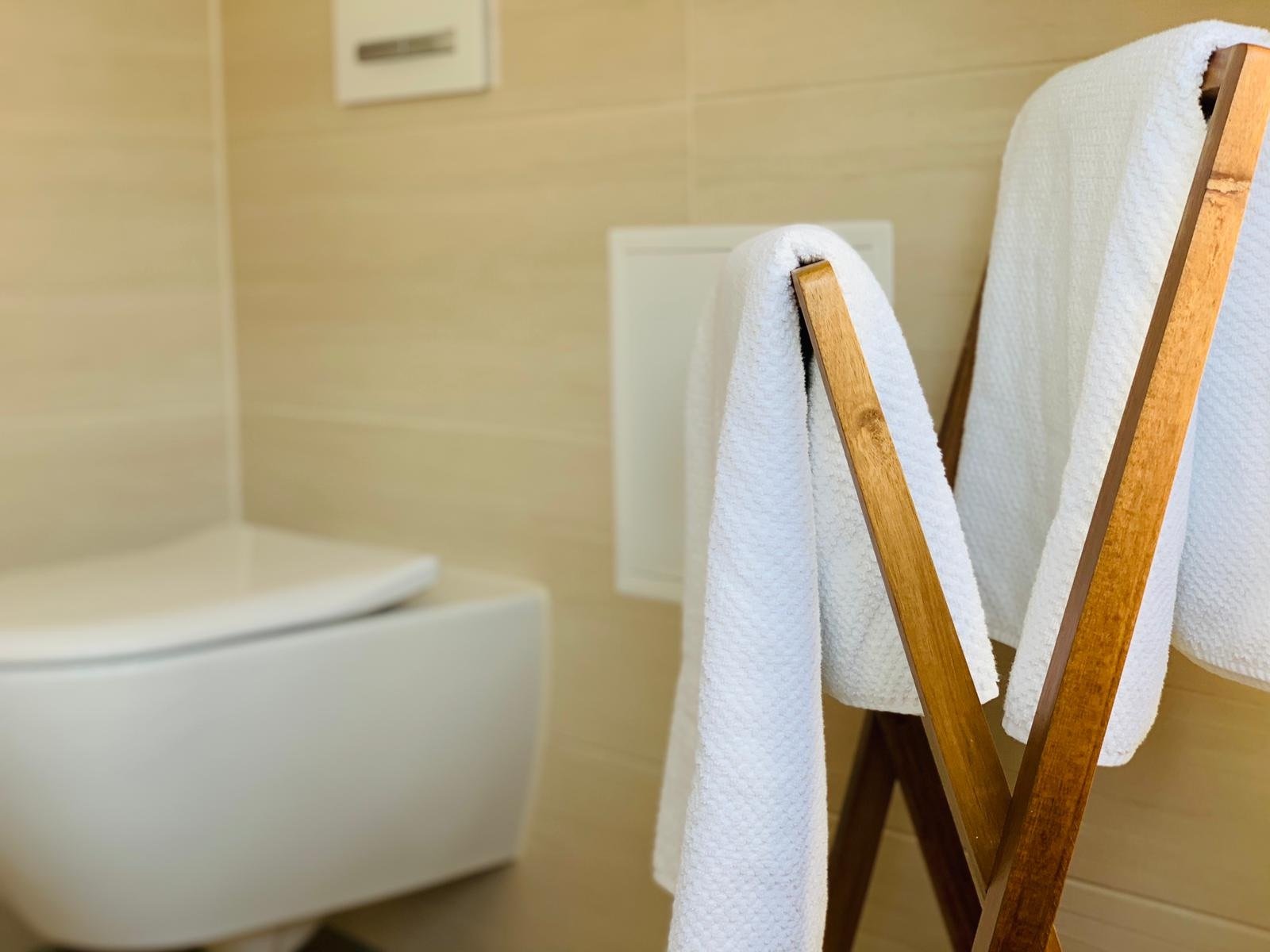 Das helle Duschbad bietet neben seiner einladenden Atmosphäre Hand- und Duschtücher, einen Fön sowie eine Grundausstattung an Toilettenpapier.