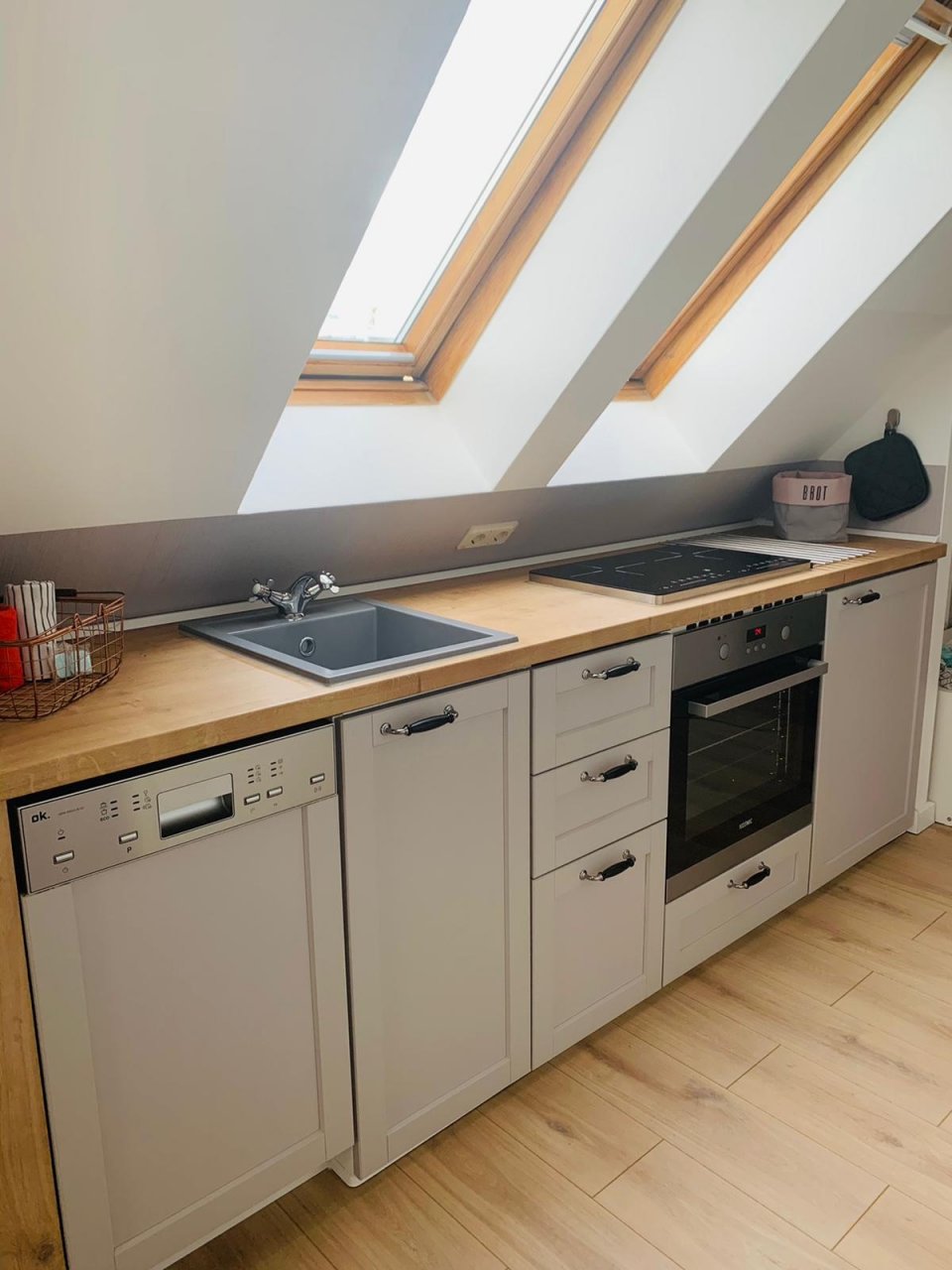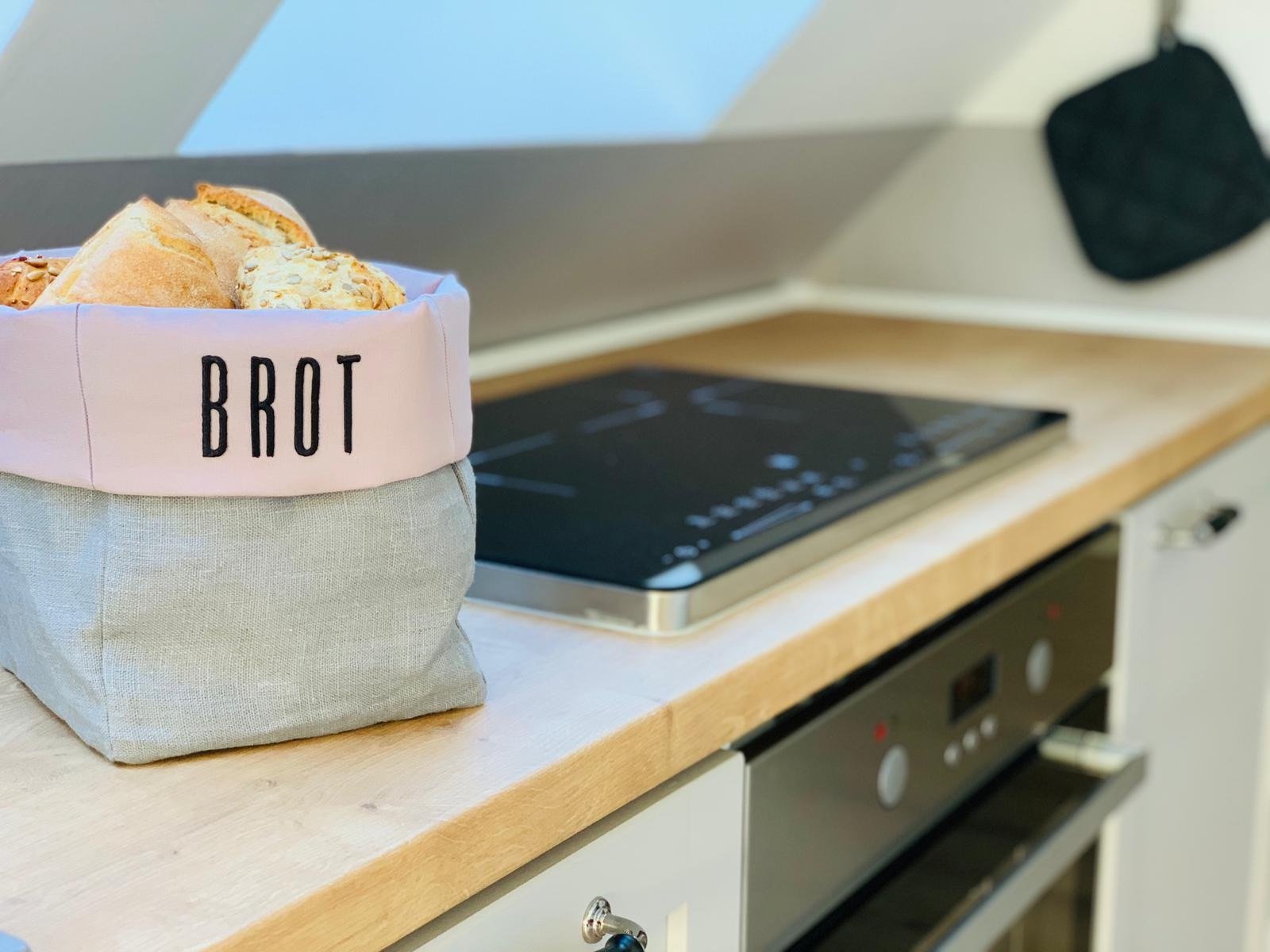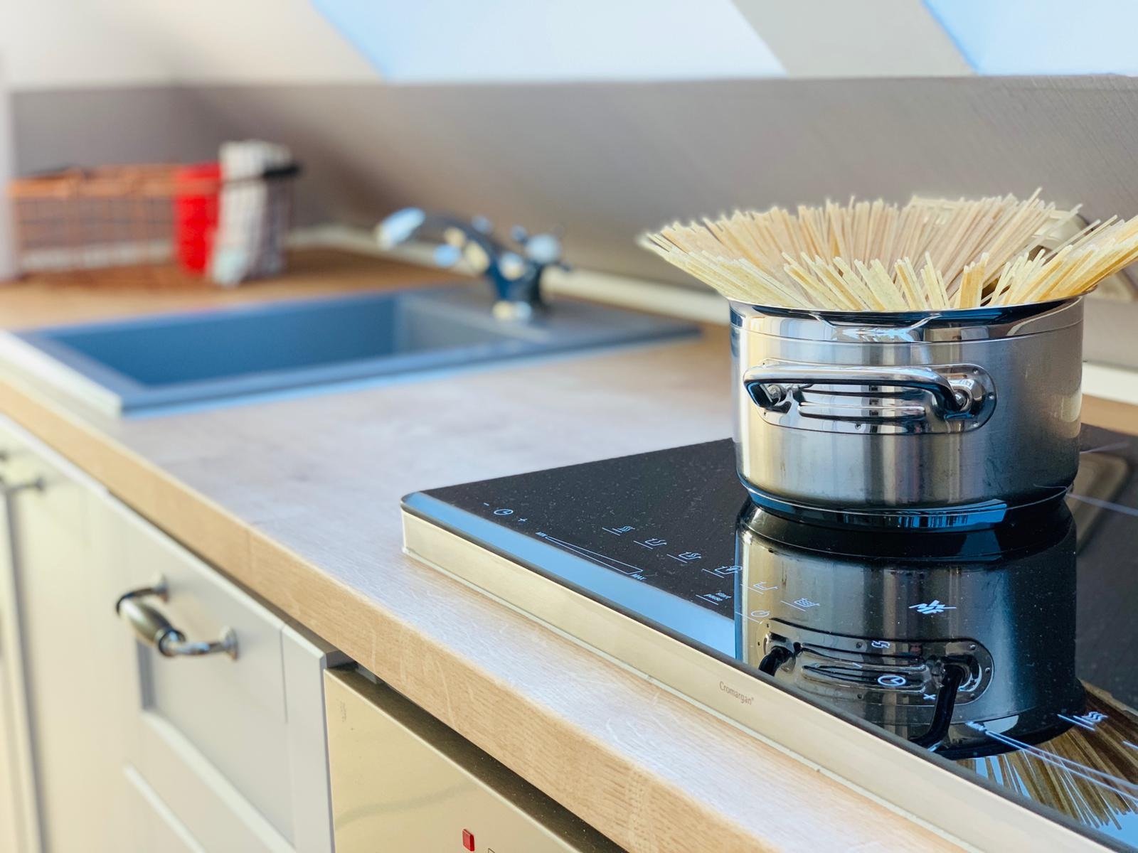 Die Küche ist mit Induktionskochfeld, Backofen, Kaffeemaschine (Tchibo Kapseln), Wasserkocher, Toaster Geschirr, Besteck Gläser, Tassen und Geschirrspüler ausgestattet.